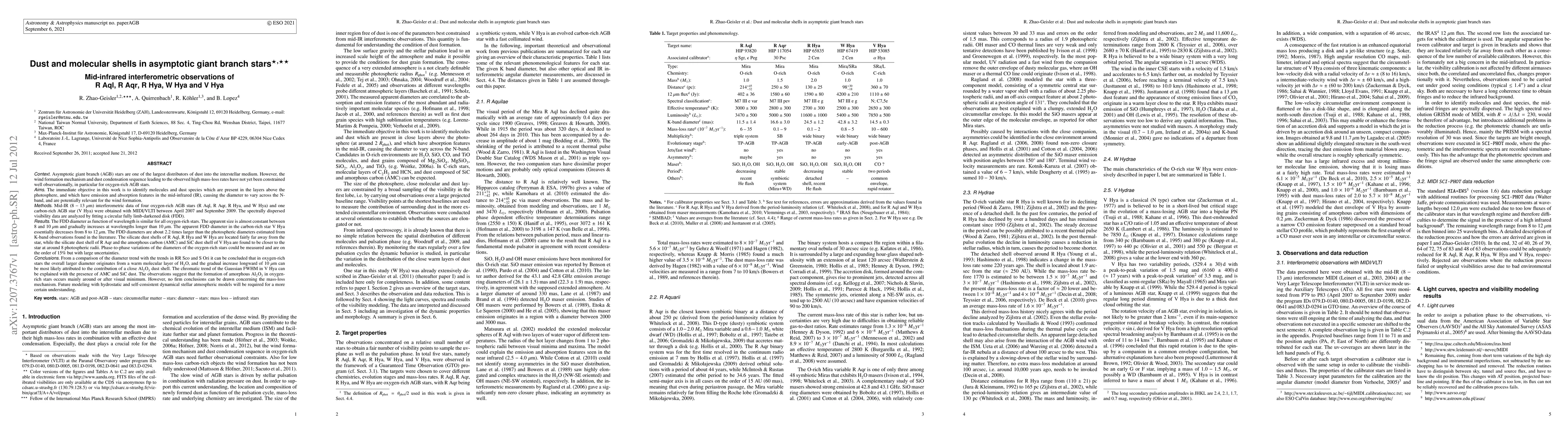This study uses mid-IR interferometric observations to analyze the dust and molecular shells in five asymptotic giant branch stars. The results show that oxygen-rich stars exhibit a larger, relatively constant apparent size in the mid-IR, while the carbon-rich star shows a decreasing size trend, suggesting different dust shell compositions and distances from the stars.