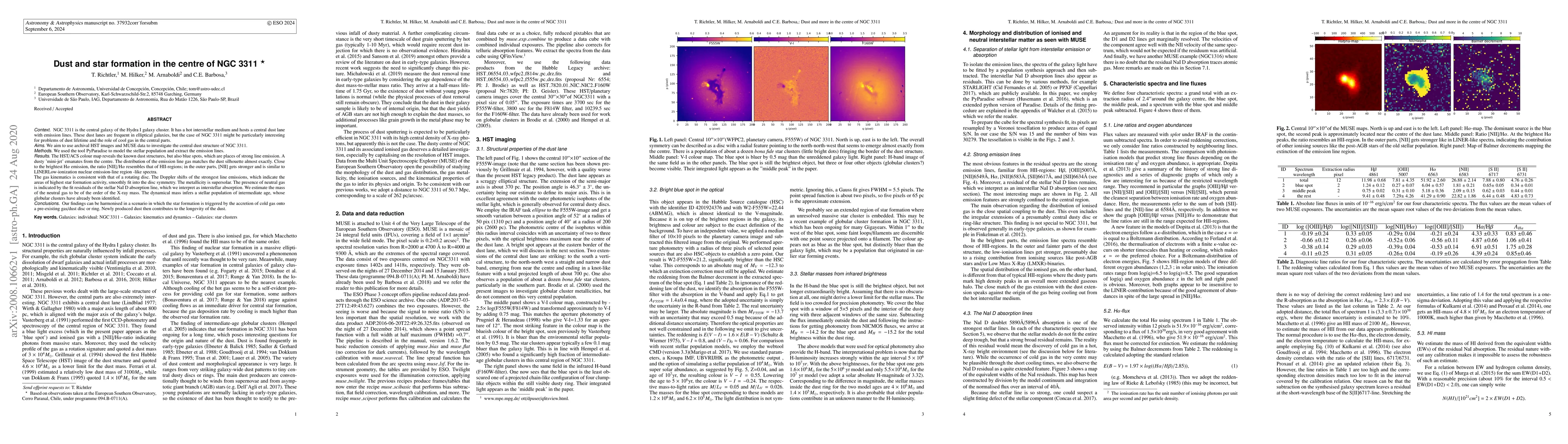NGC 3311 is the central galaxy of the Hydra I galaxy cluster. It has a hot interstellar medium and hosts a central dust lane with emission lines. These dust lanes are frequent in elliptical galaxies, but the case of NGC 3311 might be particularly interesting for problems of dust lifetime and the role of cool gas in the central parts. We aim to use archival HST images and MUSE data to investigate the central dust structure of NGC 3311. We used the tool PyParadise to model the stellar population and extract the emission lines. The HST/ACS colour map reveals the known dust structures, but also blue spots, which are places of strong line emission. A dusty 'mini-jet' emanates from the centre. The distribution of the emission line gas matches the dust silhouette almost exactly. Close to the brightest Halpha emission, the ratio [NII]/Halpha resembles that of HII-regions; in the outer parts, [NII] gets stronger and is similar to LINER-like spectra. The gas kinematics is consistent with that of a rotating disc. The Doppler shifts of the strongest line emissions, which indicate the areas of highest star formation activity, smoothly fit into the disc symmetry. The metallicity is supersolar. The presence of neutral gas is indicated by the fit residuals of the stellar NaI D absorption line, which we interpret as interstellar absorption. We estimate the mass of the neutral gas to be of the order of the X-ray mass. The dynamical mass infers a stellar population of intermediate age, whose globular clusters have already been identified. Our findings can be harmonised in a scenario in which the star formation is triggered by the accretion of cold gas onto a pre-existing gas/dust disc or ring. Newly produced dust then contributes to the longevity of the dust.