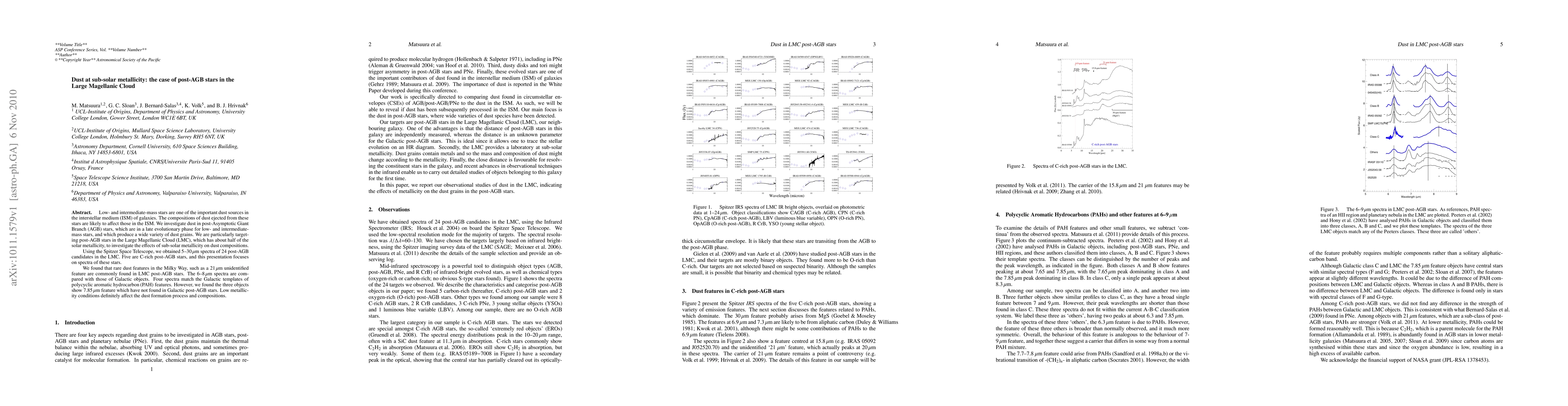 This study investigates dust in C-rich post-AGB stars in the Large Magellanic Cloud (LMC) using Spitzer Space Telescope data. It finds that sub-solar metallicity significantly influences dust compositions, revealing rare dust features common in the LMC but absent in the Milky Way, including a unique 7.85 micron feature.