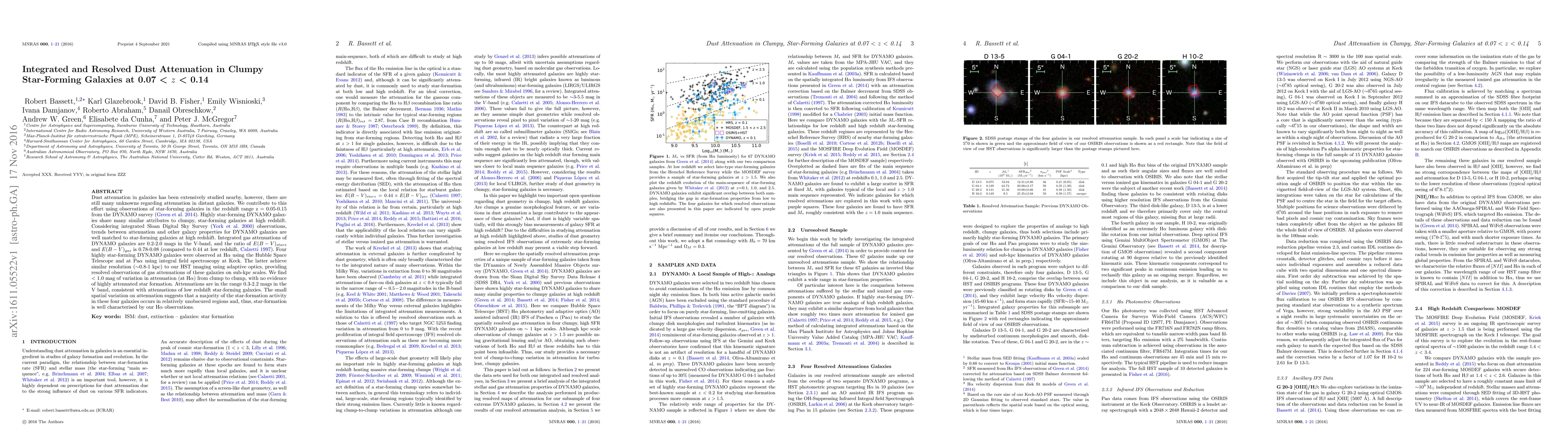 Dust attenuation in galaxies has been extensively studied nearby, however, there are still many unknowns regarding attenuation in distant galaxies. We contribute to this effort using observations of star-forming galaxies in the redshift range z = 0.05-0.15 from the DYNAMO survey. Highly star-forming DYNAMO galaxies share many similar attributes to clumpy, star-forming galaxies at high redshift. Considering integrated Sloan Digital Sky Survey observations, trends between attenuation and other galaxy properties for DYNAMO galaxies are well matched to star-forming galaxies at high redshift. Integrated gas attenuations of DYNAMO galaxies are 0.2-2.0 mags in the V-band, and the ratio of stellar E(B-V) and gas E(B-V) is 0.78-0.08 (compared to 0.44 at low redshift). Four highly star-forming DYNAMO galaxies were observed at H-alpha using the Hubble Space Telescope and at Pa-alpha using integral field spectroscopy at Keck. The latter achieve similar resolution (~0.8-1 kpc) to our HST imaging using adaptive optics, providing resolved observations of gas attenuations of these galaxies on sub-kpc scales. We find < 1.0 mag of variation in attenuation (at H-alpha) from clump to clump, with no evidence of highly attenuated star formation. Attenuations are in the range 0.3-2.2 mags in the V band, consistent with attenuations of low redshift star-forming galaxies. The small spatial variation on attenuation suggests that a majority of the star-formation activity in these four galaxies occurs in relatively unobscured regions and, thus, star-formation is well characterised by our H-alpha observations.