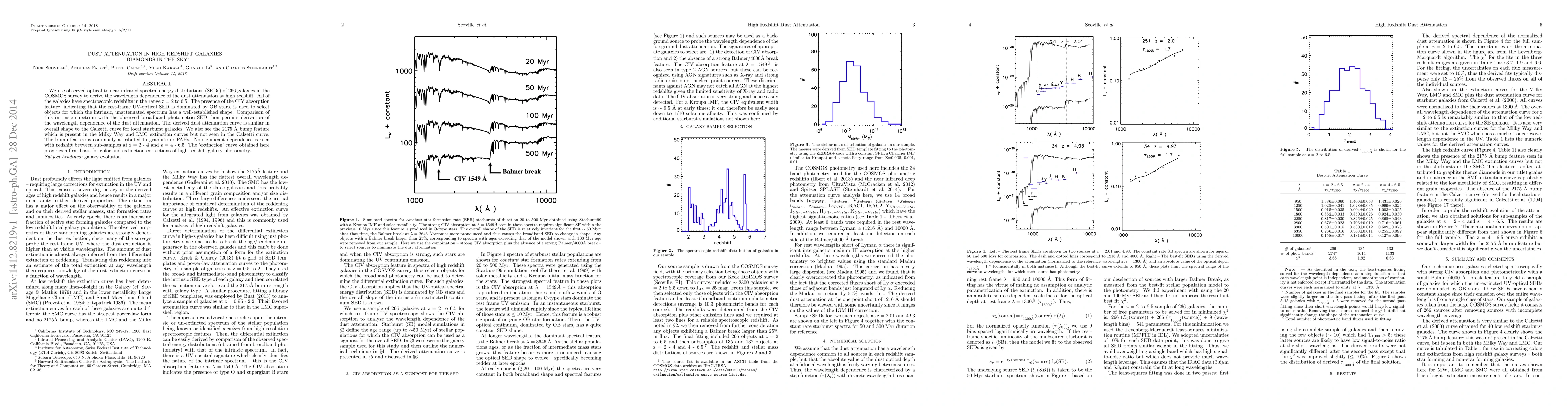 We use observed optical to near infrared spectral energy distributions (SEDs) of 266 galaxies in the COSMOS survey to derive the wavelength dependence of the dust attenuation at high redshift. All of the galaxies have spectroscopic redshifts in the range z = 2 to 6.5. The presence of the CIV absorption feature, indicating that the rest-frame UV-optical SED is dominated by OB stars, is used to select objects for which the intrinsic, unattenuated spectrum has a well-established shape. Comparison of this intrinsic spectrum with the observed broadband photometric SED then permits derivation of the wavelength dependence of the dust attenuation. The derived dust attenuation curve is similar in overall shape to the Calzetti curve for local starburst galaxies. We also see the 2175 \AA~bump feature which is present in the Milky Way and LMC extinction curves but not seen in the Calzetti curve. The bump feature is commonly attributed to graphite or PAHs. No significant dependence is seen with redshift between sub-samples at z = 2 - 4 and z = 4 - 6.5. The 'extinction' curve obtained here provides a firm basis for color and extinction corrections of high redshift galaxy photometry.