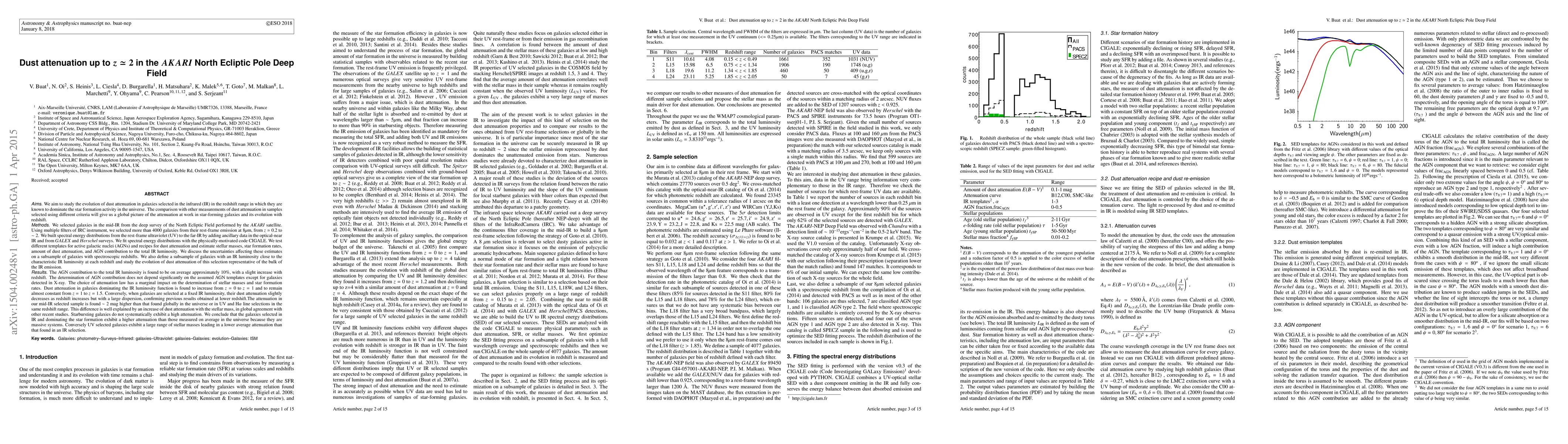 (Abridged) We aim to study the evolution of dust attenuation in galaxies selected in the IR in the redshift range in which they are known to dominate the star formation activity in the universe. The comparison with other measurements of dust attenuation in samples selected using different criteria will give us a global picture of the attenuation at work in star-forming galaxies and its evolution with redshift. Using multiple filters of IRC instrument, we selected more than 4000 galaxies from their rest-frame emission at 8 microns, from z~0.2 to 2$. We built SEDs from the rest-frame UV to the far-IR by adding data in the optical-NIR and from GALEX and Herschel surveys. We fit SEDs with the physically-motivated code CIGALE. We test different templates for AGNs and recipes for dust attenuation and estimate stellar masses, SFRs, amount of dust attenuation, and AGN contribution to the total IR luminosity. The AGN contribution to the total IR luminosity is found to be on average approximately 10% with a slight increase with redshift. Dust attenuation in galaxies dominating the IR luminosity function is found to increase from z=0 to z=1 and to remain almost constant from z=1 to z=1.5. Conversely, when galaxies are selected at a fixed IR luminosity, their dust attenuation slightly decreases as redshift increases but with a large dispersion. The attenuation in our mid-IR selected sample is found ~ 2 mag higher than that found globally in the universe or in UV and Halpha line selections in the same redshift range. This difference is well explained by an increase of dust attenuation with the stellar mass, in global agreement with other recent studies. Starbursting galaxies do not systematically exhibit a high attenuation