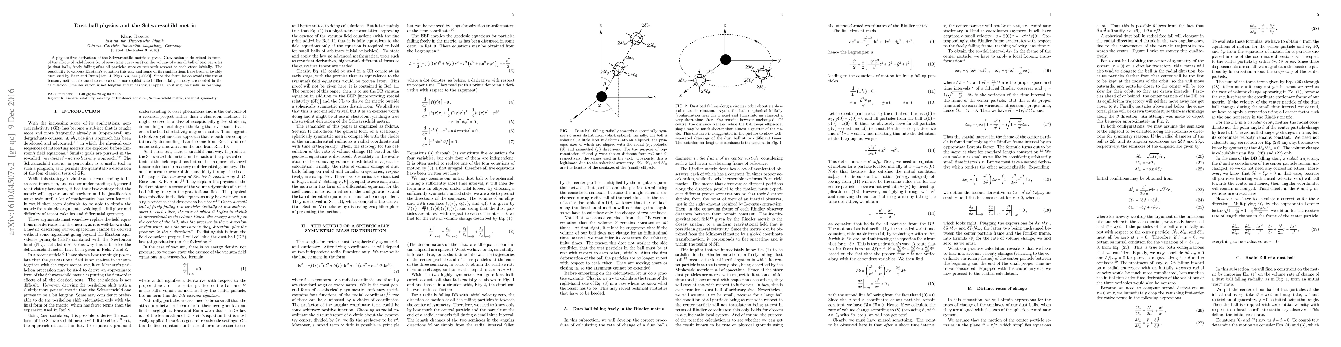 This paper derives the Schwarzschild metric using a physics-first approach based on tidal forces acting on a freely falling "dust ball" of test particles, avoiding tensor calculus and differential geometry for accessibility. The method offers a visually appealing and straightforward alternative for teaching general relativity.