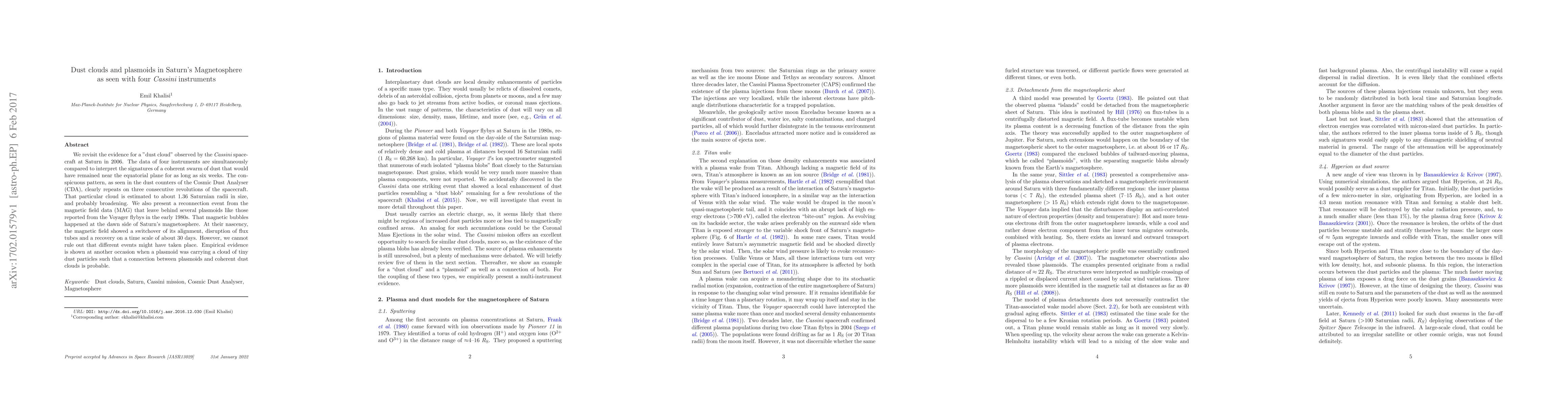 This paper revisits the 2006 "dust cloud" observation by Cassini, using data from four instruments to analyze a coherent dust swarm near Saturn's equatorial plane. It also reports a magnetic reconnection event generating plasmoids, suggesting a possible connection between these magnetic bubbles and dust clouds.