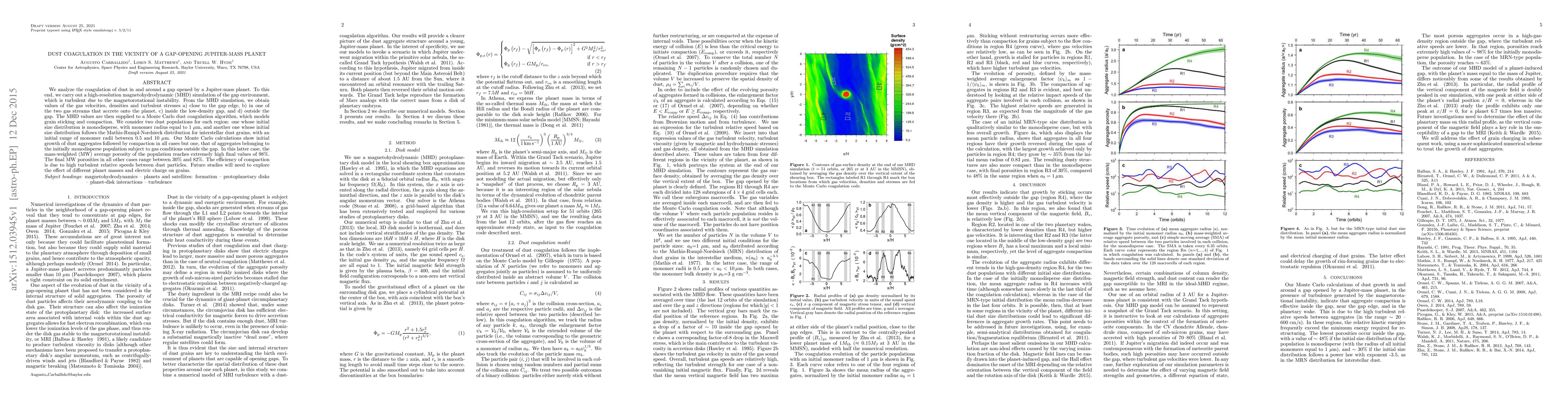 We analyze the coagulation of dust in and around a gap opened by a Jupiter-mass planet. To this end, we carry out a high-resolution magnetohydrodynamic (MHD) simulation of the gap environment, which is turbulent due to the magnetorotational instability. From the MHD simulation, we obtain values of the gas velocities, densities and turbulent stresses a) close to the gap edge, b) in one of the two gas streams that accrete onto the planet, c) inside the low-density gap, and d) outside the gap. The MHD values are then supplied to a Monte Carlo dust coagulation algorithm, which models grain sticking and compaction. We consider two dust populations for each region: one whose initial size distribution is monodisperse, with monomer radius equal to 1 $\mu$m, and another one whose initial size distribution follows the Mathis-Rumpl-Nordsieck distribution for interstellar dust grains, with an initial range of monomer radii between 0.5 and 10 $\mu$m. Our Monte Carlo calculations show initial growth of dust aggregates followed by compaction in all cases but one, that of aggregates belonging to the initially monodisperse population subject to gas conditions outside the gap. In this latter case, the mass-weighted (MW) average porosity of the population reaches extremely high final values of 98\%. The final MW porosities in all other cases range between 30\% and 82\%. The efficiency of compaction is due to high turbulent relative speeds between dust particles. Future studies will need to explore the effect of different planet masses and electric charge on grains.