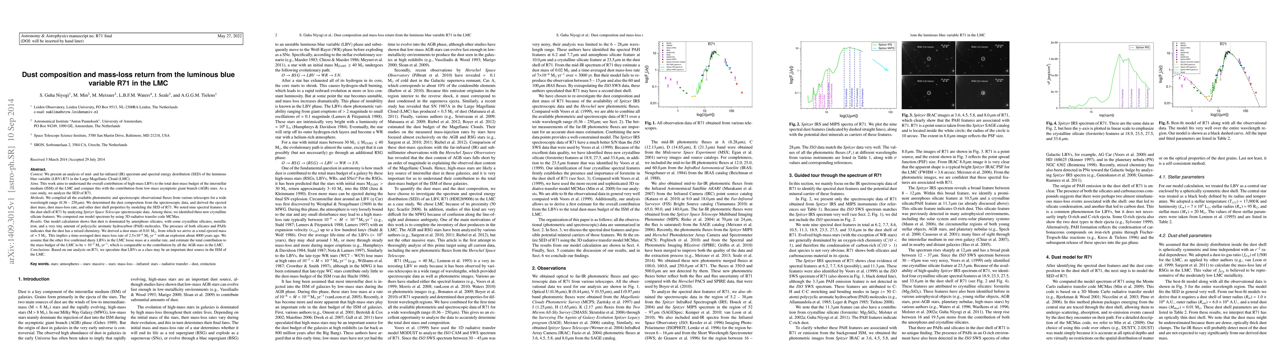 We present an analysis of mid-and far-infrared (IR) spectrum and spectral energy distribution (SED) of the LBV R71 in the LMC.This work aims to understand the overall contribution of high-mass LBVs to the total dust-mass budget of the interstellar medium (ISM) of the LMC and compare this with the contribution from low-mass asymptotic giant branch (AGB) stars. As a case study, we analyze the SED of R71. We compiled all the available photometric and spectroscopic observational fluxes from various telescopes for a wide wavelength range (0.36 -- 250\,$\mu$m). We determined the dust composition from the spectroscopic data, and derived the ejected dust mass, dust mass-loss rate, and other dust shell properties by modeling the SED of R71. We noted nine spectral features in the dust shell of R71 by analyzing Spitzer spectroscopic data. Among these, we identified three new crystalline silicate features. We computed our model spectrum by using 3D radiative transfer code MCMax. Our model calculation shows that dust is dominated by amorphous silicates, with some crystalline silicates, metallic iron, and a very tiny amount of polycyclic aromatic hydrocarbon (PAH) molecules. The presence of both silicates and PAHs indicates that the dust has a mixed chemistry. We derived a dust mass of 0.01 M$_\odot$, from which we arrive at a total ejected mass of $\approx$ 5 M$_\odot$. This implies a time-averaged dust mass-loss rate of 2.5$\times$10$^{-6}$ M$_\odot$\,yr$^{-1}$ with an explosion about 4000 years ago. We assume that the other five confirmed dusty LBVs in the LMC loose mass at a similar rate, and estimate the total contribution to the mass budget of the LMC to be $\approx$ 10$^{-5}$ M$_\odot$\,yr$^{-1}$, which is comparable to the contribution by all the AGB stars in the LMC. Based on our analysis on R71, we speculate that LBVs as a class may be an important dust source in the ISM of the LMC.