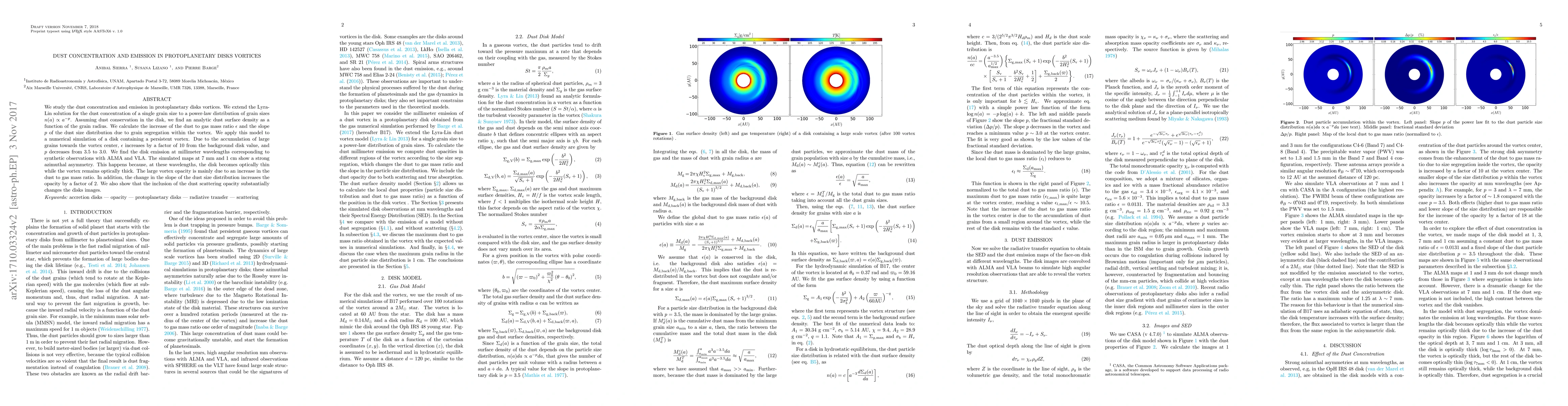 We study the dust concentration and emission in protoplanetary disks vortices. We extend the Lyra-Lin solution for the dust concentration of a single grain size to a power-law distribution of grain sizes $n(a) \propto a^{-p}$. Assuming dust conservation in the disk, we find an analytic dust surface density as a function of the grain radius. We calculate the increase of the dust to gas mass ratio $\epsilon$ and the slope $p$ of the dust size distribution due to grain segregation within the vortex. We apply this model to a numerical simulation of a disk containing a persistent vortex. Due to the accumulation of large grains towards the vortex center, $\epsilon$ increases by a factor of 10 from the background disk value, and $p$ decreases from 3.5 to 3.0. We find the disk emission at millimeter wavelengths corresponding to synthetic observations with ALMA and VLA. The simulated maps at 7 mm and 1 cm show a strong azimuthal asymmetry. This happens because, at these wavelengths, the disk becomes optically thin while the vortex remains optically thick. The large vortex opacity is mainly due to an increase in the dust to gas mass ratio. In addition, the change in the slope of the dust size distribution increases the opacity by a factor of 2. We also show that the inclusion of the dust scattering opacity substantially changes the disks images.