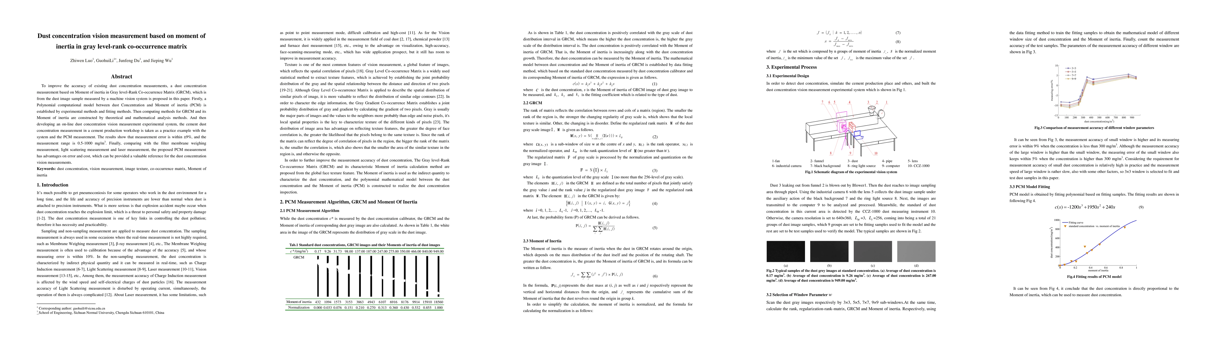 This paper proposes a new method for measuring dust concentration using the moment of inertia in a Gray level-Rank Co-occurrence Matrix (GRCM) derived from machine vision images. The method shows a measurement error within 9% and a range of 0.5-1000 mg/m³, outperforming traditional methods in terms of accuracy and cost.