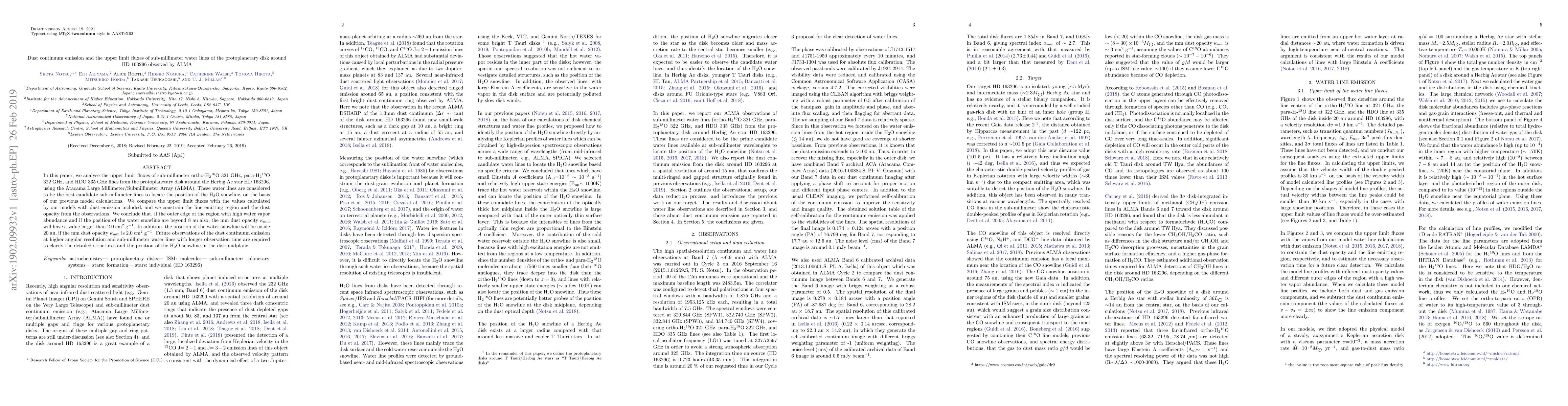 This study uses ALMA to observe water lines in a protoplanetary disk around HD 163296, finding that dust opacity is crucial for locating the H2O snowline and constraining its position within 20 au of the star.