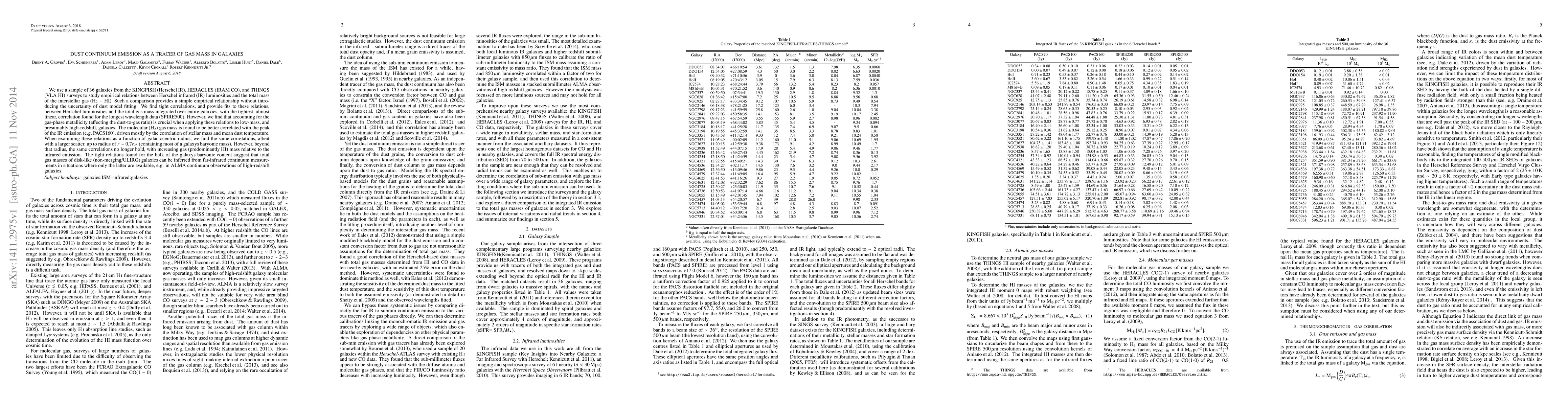 We use a sample of 36 galaxies from the KINGFISH (Herschel IR), HERACLES (IRAM CO), and THINGS (VLA HI) surveys to study empirical relations between Herschel infrared (IR) luminosities and the total mass of the interstellar gas (H2+HI). Such a comparison provides a simple empirical relationship without introducing the uncertainty of dust model fitting. We find tight correlations, and provide fits to these relations, between Herschel luminosities and the total gas mass integrated over entire galaxies, with the tightest, almost linear, correlation found for the longest wavelength data (SPIRE500). However, we find that accounting for the gas-phase metallicity (affecting the dust-to-gas ratio) is crucial when applying these relations to low-mass, and presumably high-redshift, galaxies. The molecular (H2) gas mass is found to be better correlated with the peak of the IR emission (e.g. PACS160), driven mostly by the correlation of stellar mass and mean dust temperature. When examining these relations as a function of galactocentric radius we find the same correlations, albeit with a larger scatter, up to a radius of 0.7 r_25 (within which most of the galaxy's baryonic mass resides). However, beyond this radius the same correlations no longer hold, with the gas mass (predominantly HI) increasing relative to the infrared emission. The tight relations found for the bulk of the galaxy's baryonic content suggest that the total gas masses of disk-like (non-merging) galaxies can be inferred from far-infrared continuum measurements in situations where only the latter are available, e.g. in ALMA continuum observations of high-redshift galaxies.