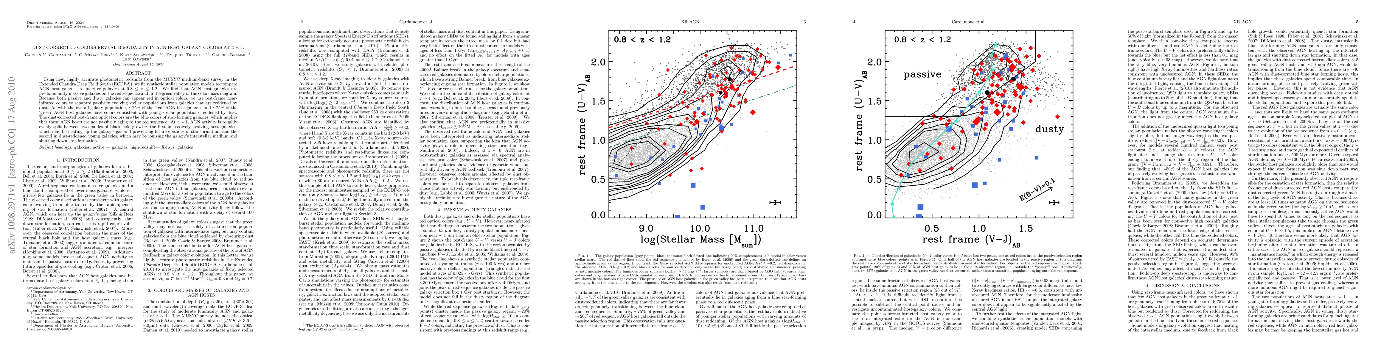 Using new, highly accurate photometric redshifts from the MUSYC medium-band survey in the Extended Chandra Deep Field South (ECDF-S), we fit synthetic stellar population models to compare AGN host galaxies to inactive galaxies at 0.8 < z < 1.2. We find that AGN host galaxies are predominantly massive galaxies on the red sequence and in the green valley of the color-mass diagram. Because both passive and dusty galaxies can appear red in optical colors, we use rest-frame near-infrared colors to separate passively evolving stellar populations from galaxies that are reddened by dust. As with the overall galaxy population, ~25% of the `red' AGN host galaxies and ~75% of the `green' AGN host galaxies have colors consistent with young stellar populations reddened by dust. The dust-corrected rest-frame optical colors are the blue colors of star-forming galaxies, which implies that these AGN hosts are not passively aging to the red sequence. At z~1, AGN activity is roughly evenly split between two modes of black hole growth: the first in passively evolving host galaxies, which may be heating up the galaxy's gas and preventing future episodes of star formation, and the second in dust-reddened young galaxies, which may be ionizing the galaxy's interstellar medium and shutting down star formation.
