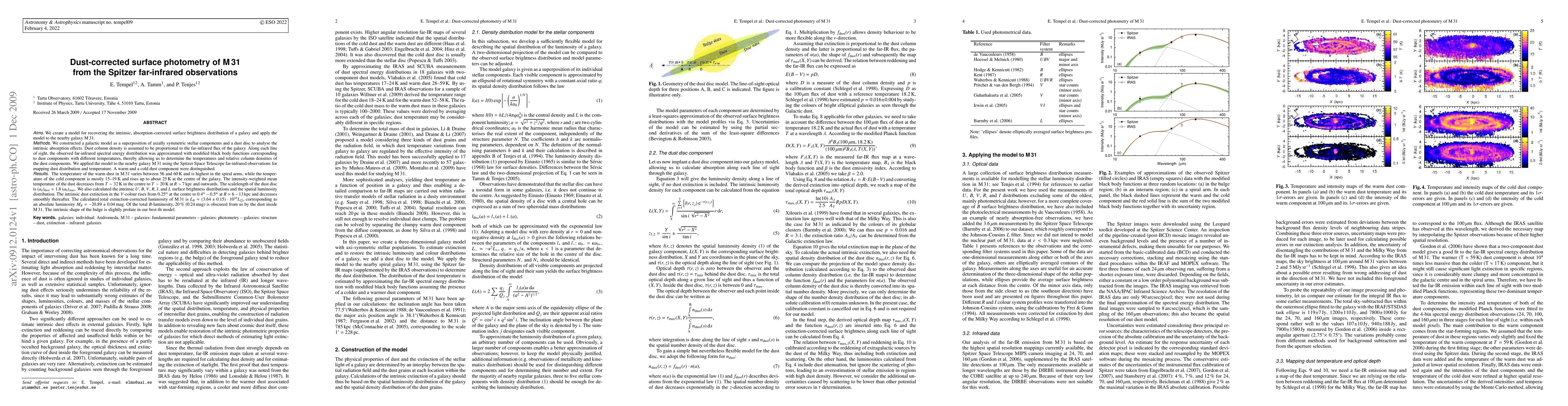 We create a model for recovering the intrinsic, absorption-corrected surface brightness distribution of a galaxy and apply the model to the M31. We construct a galactic model as a superposition of axially symmetric stellar components and a dust disc to analyse the intrinsic absorption efects. Dust column density is assumed to be proportional to the far-infrared flux of the galaxy. Along each line of sight, the observed far-infrared spectral energy distribution is approximated with modified black body functions considering dust components with different temperatures, allowing to determine the temperatures and relative column densities of the dust components. We apply the model to the nearby galaxy M31 using the Spitzer Space Telescope far-infrared observations for mapping dust distribution and temperature. A warm and a cold dust component are distinguished. The temperature of the warm dust in M31 varies between 56 and 60 K and is highest in the spiral arms; the temperature of the cold component is mostly 15-19 K and rises up to about 25 K at the centre of the galaxy. The intensity-weighted mean temperature of the dust decreases from T ~32 K at the centre to T ~20 K at R ~7 kpc and outwards. We also calculate the intrinsic UBVRIL surface brightness distributions and the spatial luminosity distribution. The intrinsic dust extinction in the V-colour rises from 0.25 mag at the centre to 0.4-0.5 mag at R = 6-13 kpc and decreases smoothly thereafter. The calculated total extinction-corrected luminosity of M31 is L_B = (3.64 pm 0.15) 10^10L_sun, corresponding to an absolute luminosity M_B = (-20.89 pm 0.04) mag. Of the total B-luminosity, 20% (0.24 mag) is obscured from us by the dust inside M31. The intrinsic shape of the bulge is slightly prolate in our best-fit model.
