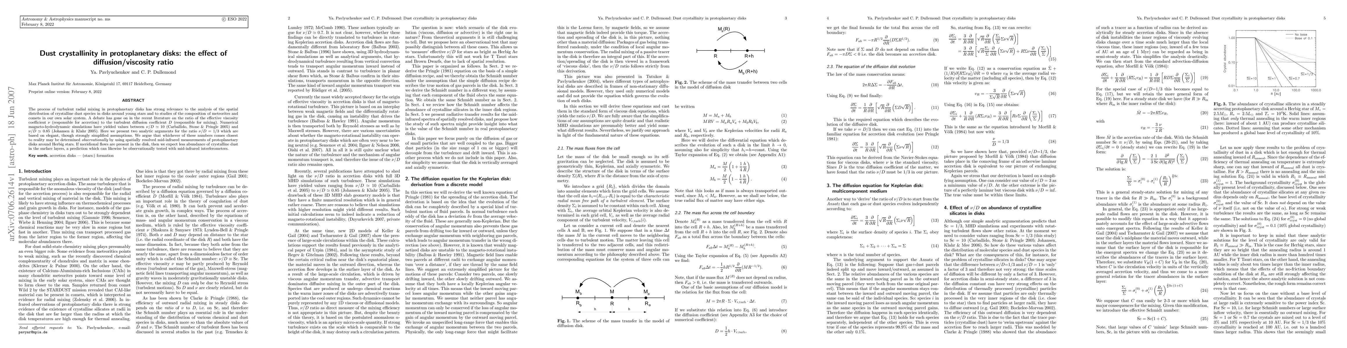 The process of turbulent radial mixing in protoplanetary disks has strong relevance to the analysis of the spatial distribution of crystalline dust species in disks around young stars and to studies of the composition of meteorites and comets in our own solar system. A debate has gone on in the recent literature on the ratio of the effective viscosity coefficient $\nu$ (responsible for accretion) to the turbulent diffusion coefficient $D$ (responsible for mixing). Numerical magneto-hydrodynamic simulations have yielded values between $\nu/D\simeq 10$ (Carballido, Stone & Pringle, 2005) and $\nu/D\simeq 0.85$ (Johansen & Klahr, 2005}). Here we present two analytic arguments for the ratio $\nu/D=1/3$ which are based on elegant, though strongly simplified assumptions. We argue that whichever of these numbers comes closest to reality may be determined {\em observationally} by using spatially resolved mid-infrared measurements of protoplanetary disks around Herbig stars. If meridional flows are present in the disk, then we expect less abundance of crystalline dust in the surface layers, a prediction which can likewise be observationally tested with mid-infrared interferometers.
