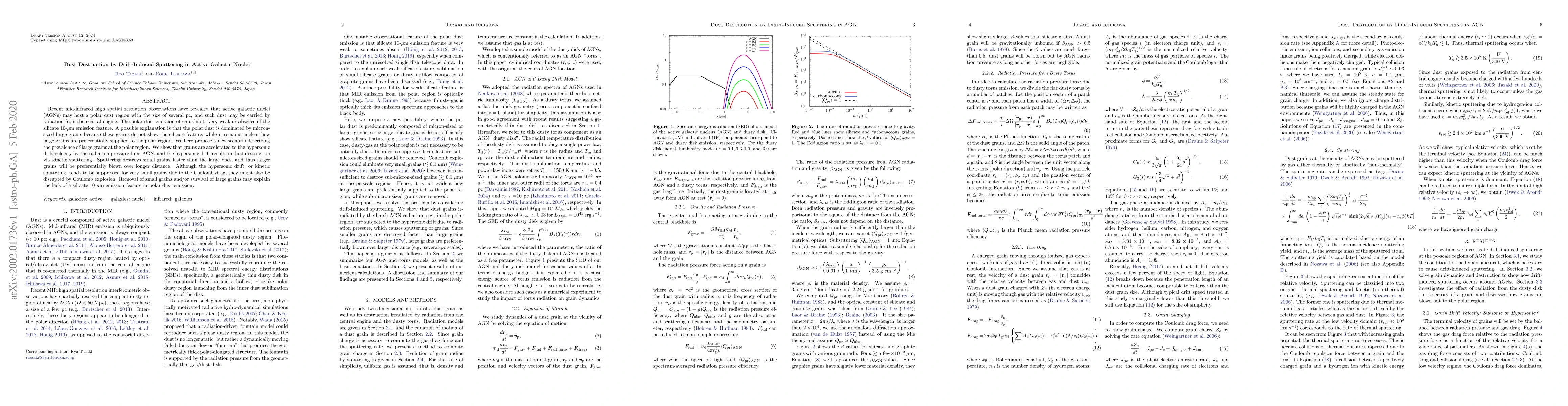This paper proposes a mechanism for dust destruction in active galactic nuclei (AGNs) via drift-induced sputtering, explaining the absence of silicate emission features in polar dust regions. The radiation pressure from AGNs accelerates grains to hypersonic speeds, leading to kinetic sputtering that preferentially destroys smaller grains, leaving larger grains intact and carried over longer distances.