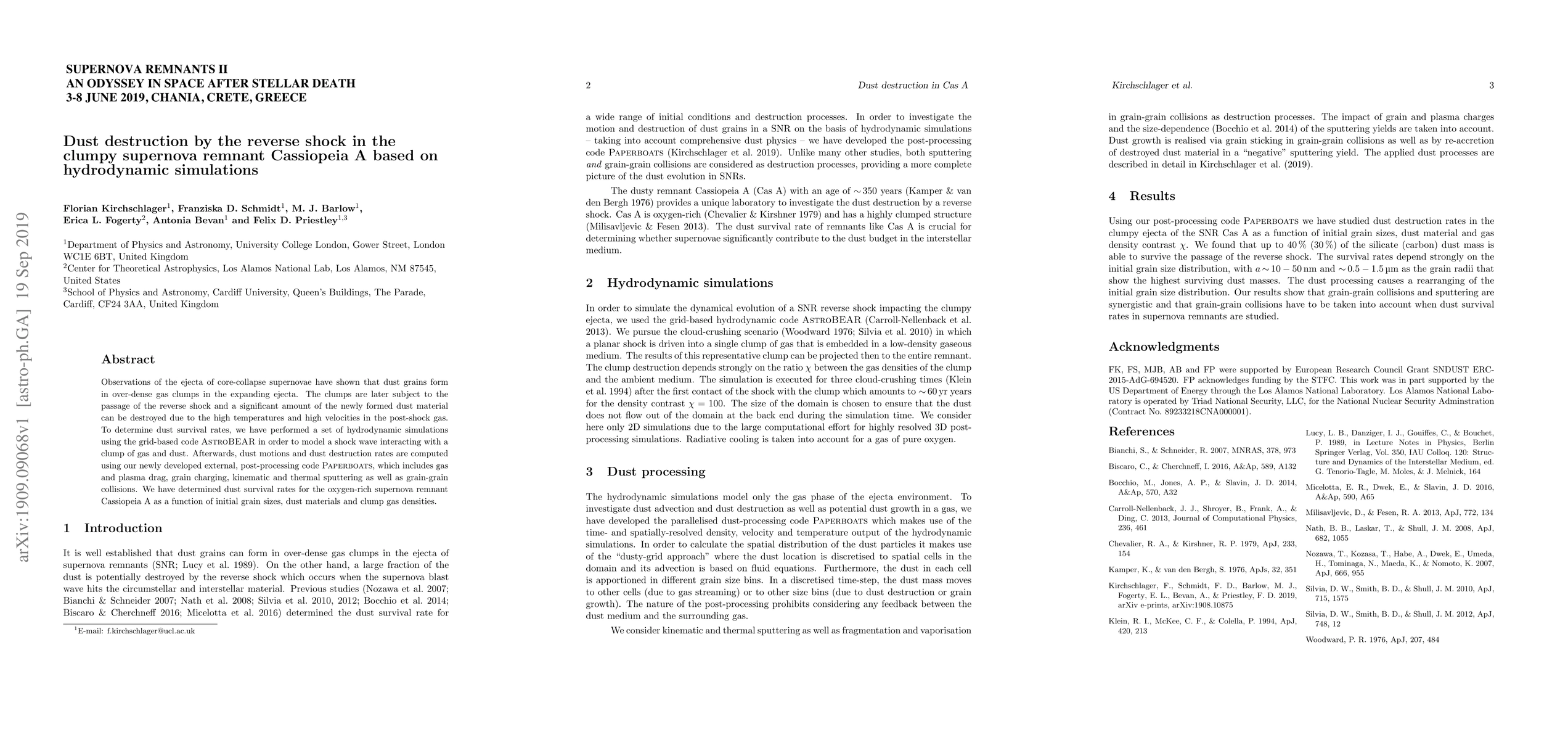 Observations of the ejecta of core-collapse supernovae have shown that dust grains form in over-dense gas clumps in the expanding ejecta. The clumps are later subject to the passage of the reverse shock and a significant amount of the newly formed dust material can be destroyed due to the high temperatures and high velocities in the post-shock gas. To determine dust survival rates, we have performed a set of hydrodynamic simulations using the grid-based code AstroBEAR in order to model a shock wave interacting with a clump of gas and dust. Afterwards, dust motions and dust destruction rates are computed using our newly developed external, post-processing code Paperboats, which includes gas and plasma drag, grain charging, kinematic and thermal sputtering as well as grain-grain collisions. We have determined dust survival rates for the oxygen-rich supernova remnant Cassiopeia A as a function of initial grain sizes, dust materials and clump gas densities.