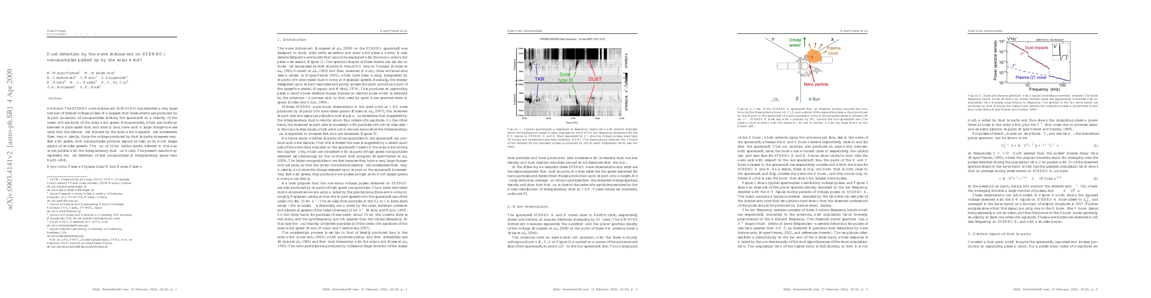 The STEREO/WAVES instrument has detected a very large number of intense voltage pulses. We suggest that these events are produced by impact ionisation of nanoparticles striking the spacecraft at a velocity of the order of magnitude of the solar wind speed. Nanoparticles, which are half-way between micron-sized dust and atomic ions, have such a large charge-to-mass ratio that the electric field induced by the solar wind magnetic field accelerates them very efficiently. Since the voltage produced by dust impacts increases very fast with speed, such nanoparticles produce signals as high as do much larger grains of smaller speeds. The flux of 10-nm radius grains inferred in this way is compatible with the interplanetary dust flux model. The present results may represent the first detection of fast nanoparticles in interplanetary space near Earth orbit.