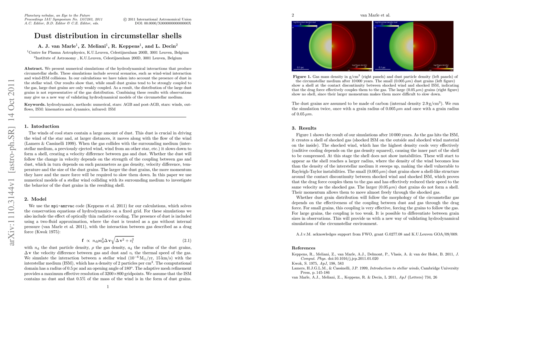 This paper uses numerical simulations to study hydrodynamical interactions forming circumstellar shells, focusing on the behavior of dust grains. It finds that large dust grains are weakly coupled to the gas, leading to a distribution that differs from the gas, which could provide new validation methods for hydrodynamical models of the circumstellar medium.