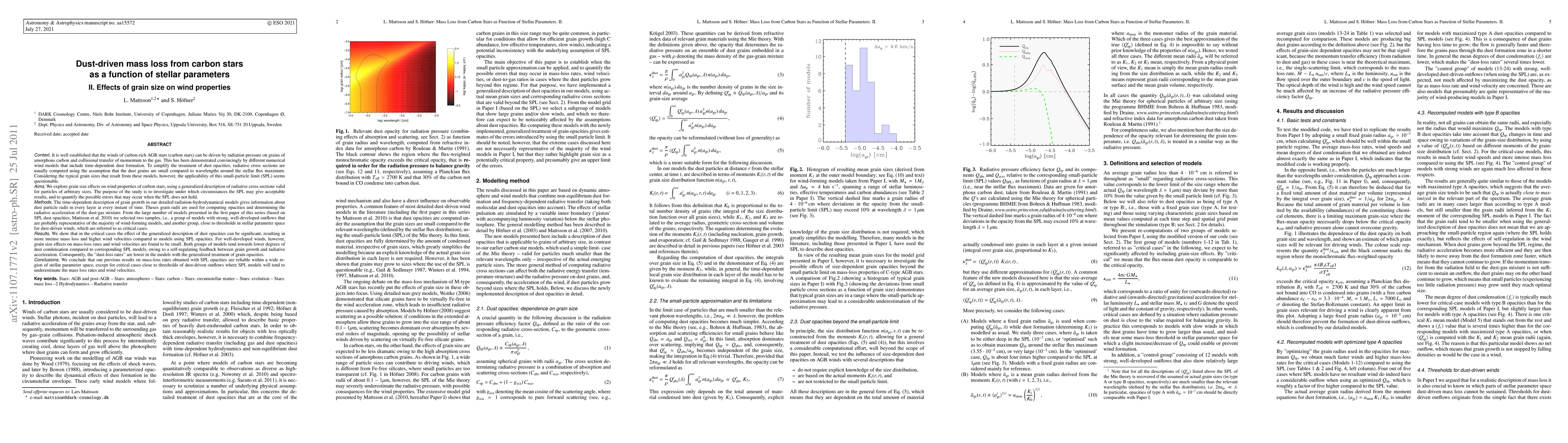 [Abridged] In this paper we explore grain size effects on wind properties of carbon stars, using a generalized description of radiative cross sections valid for particles of arbitrary sizes. The purpose of the study is to investigate under which circumstances the small particle limit (SPL) may give acceptable results, and to quantify the possible errors that may occur when it does not hold. The time-dependent description of grain growth in our detailed radiation-hydrodynamical models gives information about dust particle radii in every layer at every instant of time. These grain radii are used for computing opacities and determining the radiative acceleration of the dust-gas mixture. It is shown that in the critical cases the effect of the generalized description of dust opacities can be significant, resulting in more intense mass loss and higher wind velocities compared to models using SPL opacities. For well-developed winds, however, grain size effects on mass loss rates and wind velocities are found to be small. Both groups of models tend towards lower degrees of dust condensation compared to corresponding SPL models, due to a self-regulating feedback between grain growth and radiative acceleration. Consequently, the "dust-loss rates" are lower in the models with the generalized treatment of grain opacities. We conclude that our previous results on mass loss rates obtained with SPL opacities are reliable within a wide region of stellar parameter space, except for critical cases close to thresholds of dust-driven outflows where SPL models will tend to underestimate the mass loss rates and wind velocities.