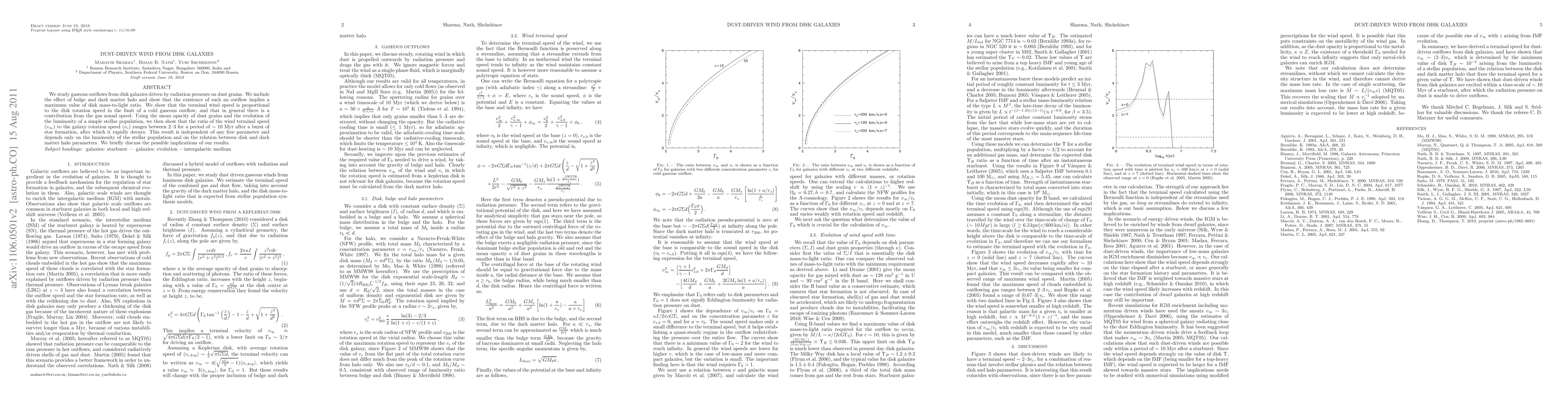 We study gaseous outflows from disc galaxies driven by radiation pressure on dust grains. We include the effect of bulge and dark matter halo and show that the existence of such an outflow implies a maximum value of disc mass-to-light ratio. We show that the terminal wind speed is proportional to the disc rotation speed in the limit of a cold gaseous outflow, and that in general there is a contribution from the gas sound speed. Using the mean opacity of dust grains and the evolution of the luminosity of a simple stellar population, we then show that the ratio of the wind terminal speed ($v_\infty$) to the galaxy rotation speed ($v_c$) ranges between $2 \hbox{--} 3$ for a period of $\sim 10$ Myr after a burst of star formation, after which it rapidly decays. This result is independent of any free parameter and depends only on the luminosity of the stellar population and on the relation between disc and dark matter halo parameters. We briefly discuss the possible implications of our results.