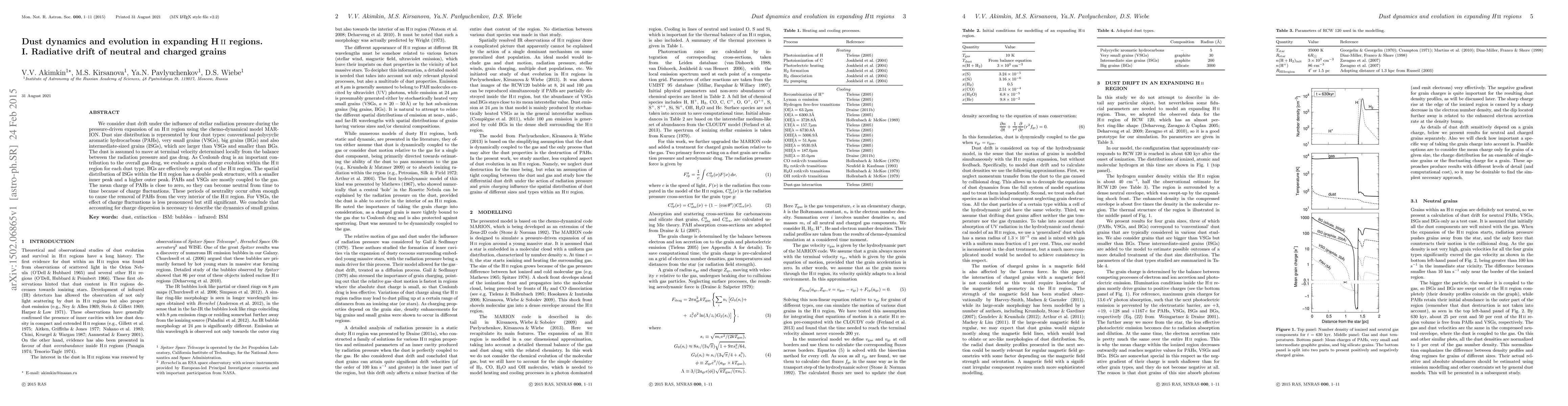 We consider dust drift under the influence of stellar radiation pressure during the pressure-driven expansion of an HII region using the chemo-dynamical model MARION. Dust size distribution is represented by four dust types: conventional polycyclic aromatic hydrocarbons (PAHs), very small grains (VSGs), big grains (BGs) and also intermediate-sized grains (ISGs), which are larger than VSGs and smaller than BGs. The dust is assumed to move at terminal velocity determined locally from the balance between the radiation pressure and gas drag. As Coulomb drag is an important contribution to the overall gas drag, we evaluate a grain charge evolution within the HII region for each dust type. BGs are effectively swept out of the HII region. The spatial distribution of ISGs within the HII region has a double peak structure, with a smaller inner peak and a higher outer peak. PAHs and VSGs are mostly coupled to the gas. The mean charge of PAHs is close to zero, so they can become neutral from time to time because of charge fluctuations. These periods of neutrality occur often enough to cause the removal of PAHs from the very interior of the HII region. For VSGs, the effect of charge fluctuations is less pronounced but still significant. We conclude that accounting for charge dispersion is necessary to describe the dynamics of small grains.