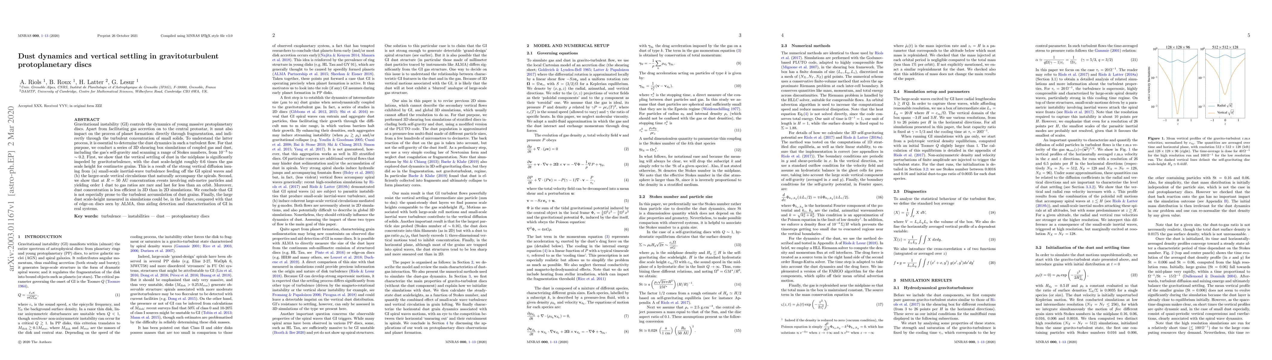 This paper investigates the dust dynamics and vertical settling in gravitoturbulent protoplanetary discs using 3D shearing box simulations. It finds that gravitoturbulence impedes dust settling, with dust scale-heights being roughly 0.6 times the gas scale-height for centimetre grains, and concludes that gravitational instability is not particularly conducive to the turbulent accumulation of dust grains.