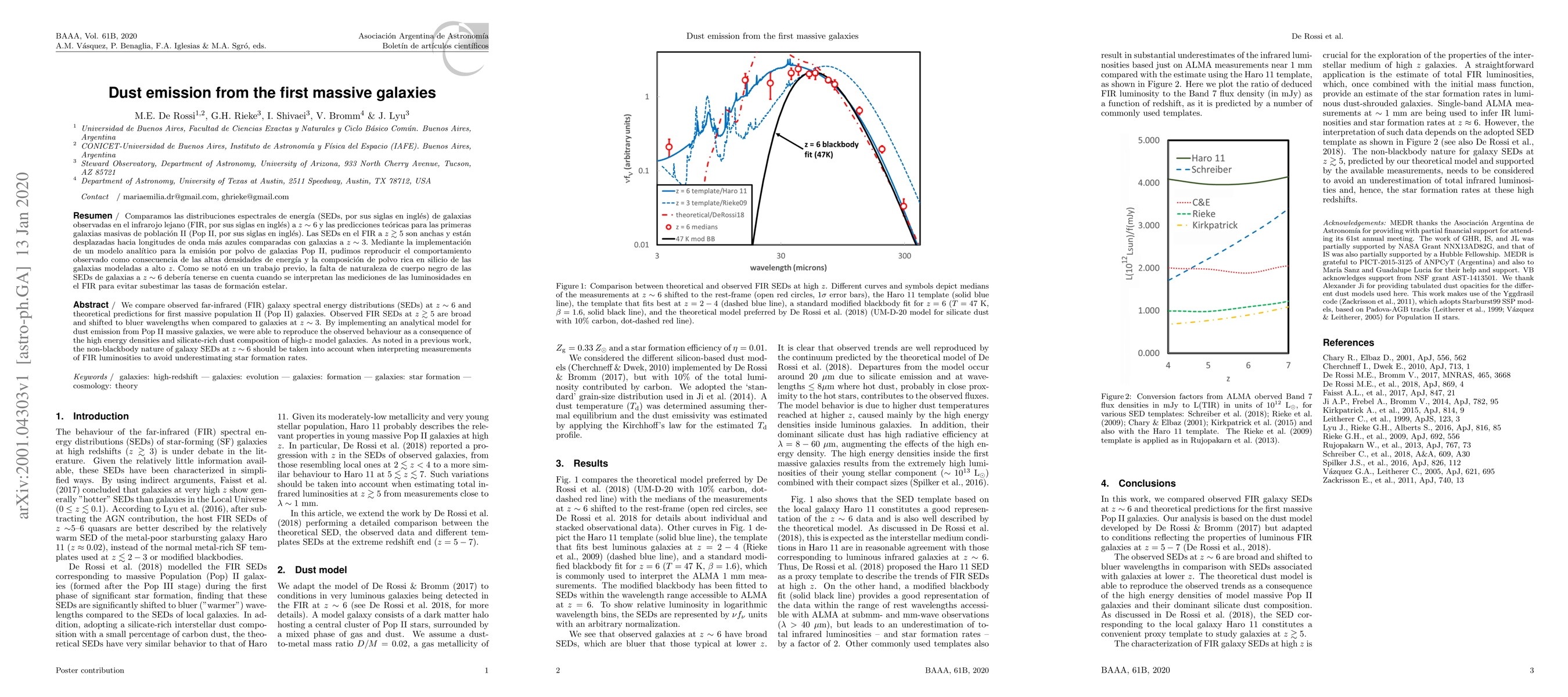 We compare observed far-infrared (FIR) galaxy spectral energy distributions (SEDs) at $z\sim6$ and theoretical predictions for first massive population II (Pop II) galaxies. Observed FIR SEDs at $z\gtrsim5$ are broad and shifted to bluer wavelengths when compared to galaxies at $z\sim3$. By implementing an analytical model for dust emission from Pop II massive galaxies,we were able to reproduce the observed behaviour as a consequence of the high energy densities and silicate-rich dust composition of high-$z$ model galaxies. As noted in a previous work, the non-blackbody nature of galaxy SEDs at $z \sim 6$ should be taken into account when interpreting measurements of FIR luminosities to avoid underestimating star formation rates.