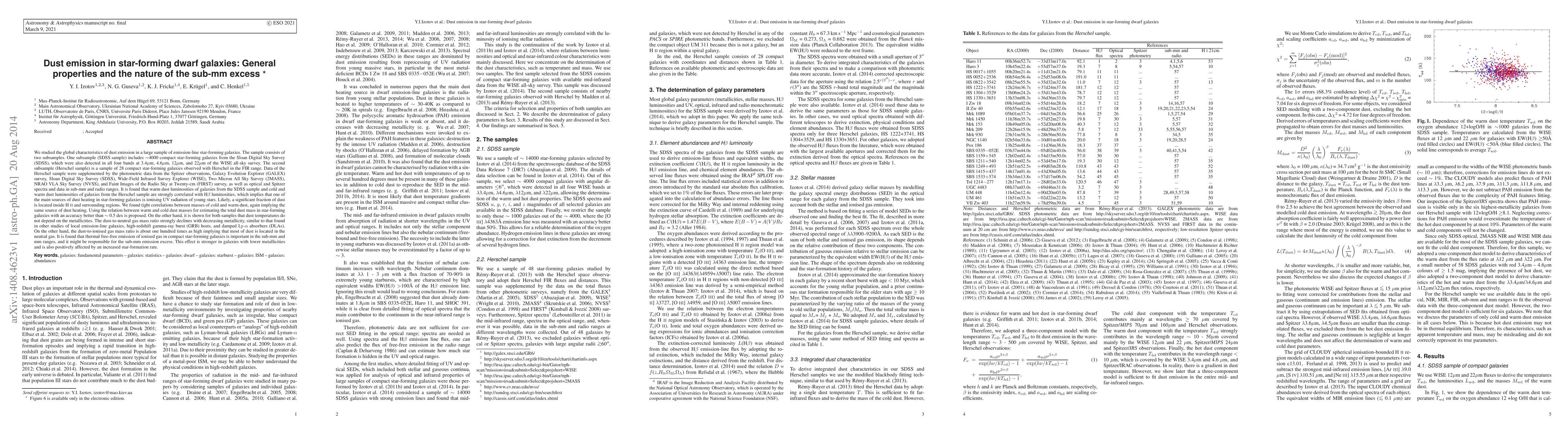 We studied the global characteristics of dust emission in a large sample of emission-line star-forming galaxies. The sample consists of two subsamples. One subsample (SDSS sample) includes ~4000 compact star-forming galaxies from the SDSS, which were also detected in all four bands at 3.4, 4.6, 12, and 22 mum of the WISE all-sky survey. The second subsample (Herschel sample) is a sample of 28 compact star-forming galaxies observed with Herschel in the FIR range. Data of the Herschel sample were supplemented by the photometric data from the Spitzer observations, GALEX, SDSS, WISE, 2MASS, NVSS, and FIRST surveys, as well as optical and Spitzer spectra and data in sub-mm and radio ranges. It is found that warm dust luminosities of galaxies from the SDSS sample and cold and warm dust luminosities of galaxies from the Herschel sample are strongly correlated with Hbeta luminosities, which implies that one of the main sources of dust heating in star-forming galaxies is ionising UV radiation of young stars. Using the relation between warm and cold dust masses for estimating the total dust mass in star-forming galaxies with an accuracy better than ~0.5 dex is proposed. On the other hand, it is shown for both samples that dust temperatures do not depend on the metallicities. The dust-to-neutral gas mass ratio strongly declines with decreasing metallicity, similar to that found in other studies of local emission-line galaxies, high-redshift GRB hosts, and DLAs. On the other hand, the dust-to-ionised gas mass ratio is about one hundred times as high implying that most of dust is located in the neutral gas. It is found that thermal free-free emission of ionised gas in compact star-forming galaxies might be responsible for the sub-mm emission excess. This effect is stronger in galaxies with lower metallicities and is also positively affected by an increased star-formation rate.