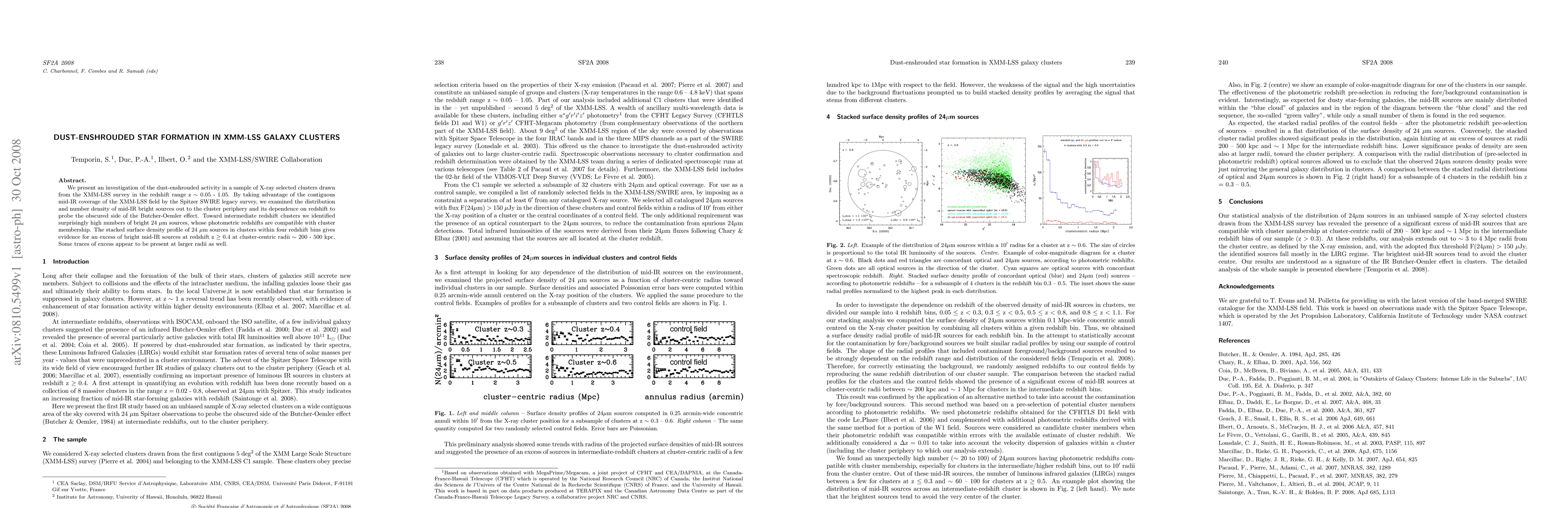 We present an investigation of the dust-enshrouded activity in a sample of X-ray selected clusters drawn from the XMM-LSS survey in the redshift range z ~ 0.05 - 1.05. By taking advantage of the contiguous mid-IR coverage of the XMM-LSS field by the Spitzer SWIRE legacy survey, we examined the distribution and number density of mid-IR bright sources out to the cluster periphery and its dependence on redshift to probe the obscured side of the Butcher-Oemler effect. Toward intermediate redshift clusters we identified surprisingly high numbers of bright 24um sources, whose photometric redshifts are compatible with cluster membership. The stacked surface density profile of 24um sources in clusters within four redshift bins gives evidence for an excess of bright mid-IR sources at redshift z $\geq$ 0.4 at cluster-centric radii ~ 200 - 500 kpc. Some traces of excess appear to be present at larger radii as well.