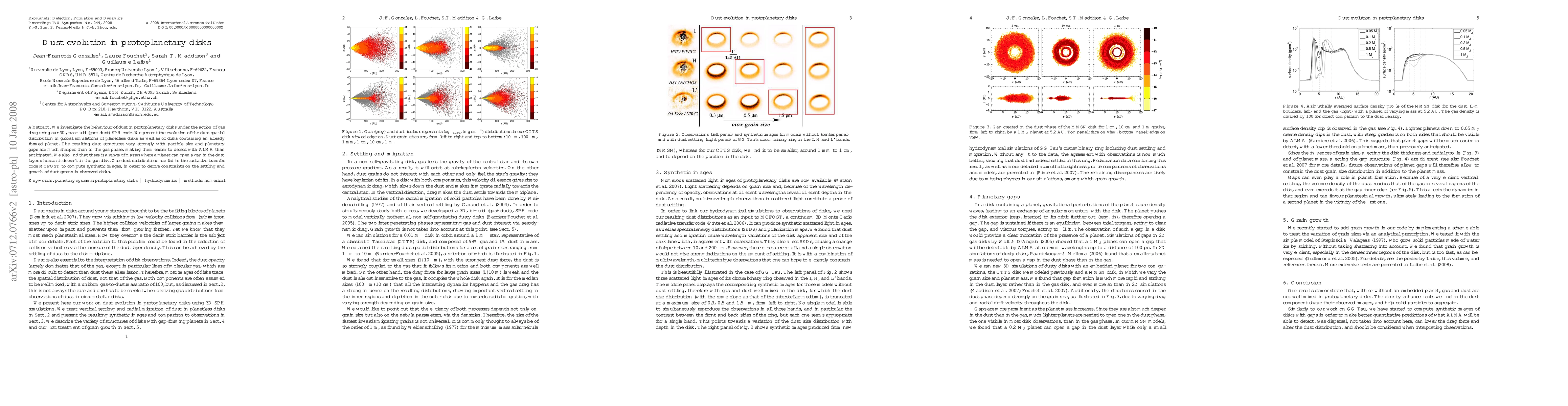 We investigate the behaviour of dust in protoplanetary disks under the action of gas drag using our 3D, two-fluid (gas+dust) SPH code. We present the evolution of the dust spatial distribution in global simulations of planetless disks as well as of disks containing an already formed planet. The resulting dust structures vary strongly with particle size and planetary gaps are much sharper than in the gas phase, making them easier to detect with ALMA than anticipated. We also find that there is a range of masses where a planet can open a gap in the dust layer whereas it doesn't in the gas disk. Our dust distributions are fed to the radiative transfer code MCFOST to compute synthetic images, in order to derive constraints on the settling and growth of dust grains in observed disks.