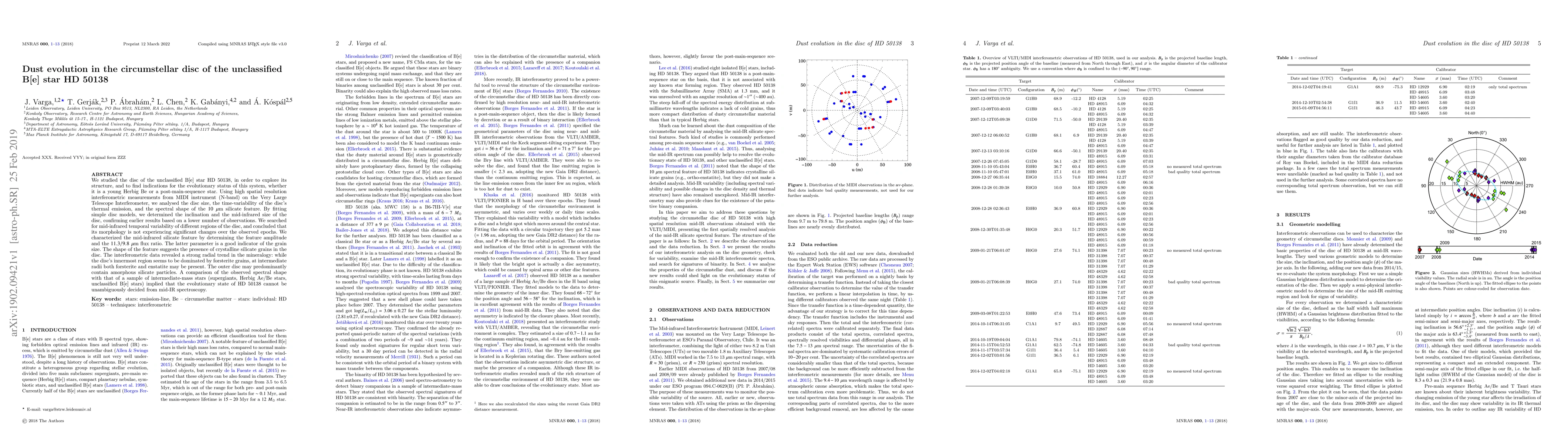 We studied the disc of the unclassified B[e] star HD 50138, in order to explore its structure, and to find indications for the evolutionary status of this system, whether it is a young Herbig Be or a post-main-sequence star. Using high spatial resolution interferometric measurements from MIDI instrument (N-band) on the Very Large Telescope Interferometer, we analysed the disc size, the time-variability of the disc's thermal emission, and the spectral shape of the $10~\mu$m silicate feature. By fitting simple disc models, we determined the inclination and the mid-infrared size of the disc, confirming earlier results based on a lower number of observations. We searched for mid-infrared temporal variability of different regions of the disc, and concluded that its morphology is not experiencing significant changes over the observed epochs. We characterized the mid-infrared silicate feature by determining the feature amplitude and the $11.3/9.8~\mu$m flux ratio. The latter parameter is a good indicator of the grain size. The shape of the feature suggests the presence of crystalline silicate grains in the disc. The interferometric data revealed a strong radial trend in the mineralogy: while the disc's innermost region seems to be dominated by forsterite grains, at intermediate radii both forsterite and enstatite may be present. The outer disc may predominantly contain amorphous silicate particles. A comparison of the observed spectral shape with that of a sample of intermediate-mass stars (supergiants, Herbig Ae/Be stars, unclassified B[e] stars) implied that the evolutionary state of HD 50138 cannot be unambiguously decided from mid-IR spectroscopy.