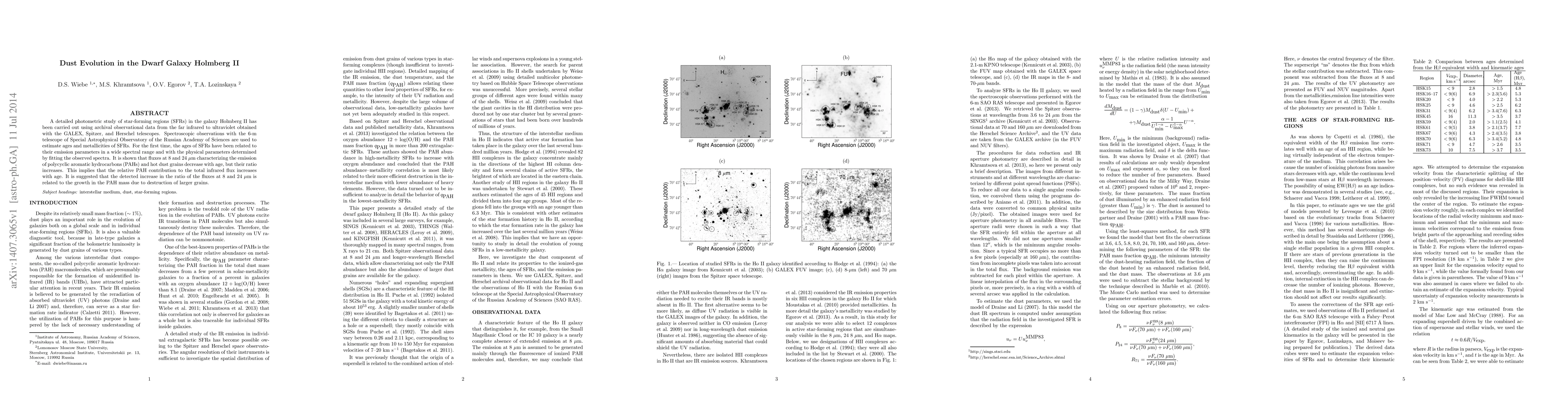 A detailed photometric study of star-forming regions (SFRs) in the galaxy Holmberg II has been carried out using archival observational data from the far infrared to ultraviolet obtained with the GALEX, Spitzer, and Herschel telescopes. Spectroscopic observations with the 6-m telescope of Special Astrophysical Observatory of the Russian Academy of Sciences are used to estimate ages and metallicities of SFRs. For the first time, the ages of SFRs have been related to their emission parameters in a wide spectral range and with the physical parameters determined by fitting the observed spectra. It is shown that fluxes at 8 and 24 micron characterizing the emission of polycyclic aromatic hydrocarbons (PAHs) and hot dust grains decrease with age, but their ratio increases. This implies that the relative PAH contribution to the total infrared flux increases with age. It is suggested that the detected increase in the ratio of the fluxes at 8 and 24 micron is related to the growth in the PAH mass due to destruction of larger grains.