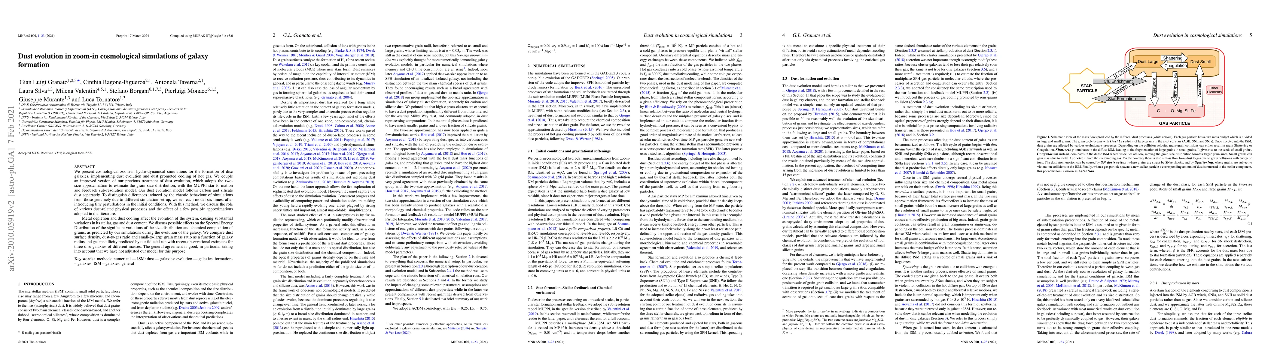 The research employs zoom-in cosmological hydro-dynamical simulations with dust evolution and dust-promoted cooling of hot gas, implementing an improved two-size dust grain size distribution model and the MUPPI star formation and feedback sub-resolution model. Six realizations of each model are run with tiny initial condition perturbations to distinguish variations due to chaotic simulation behavior from those due to different simulation setup.