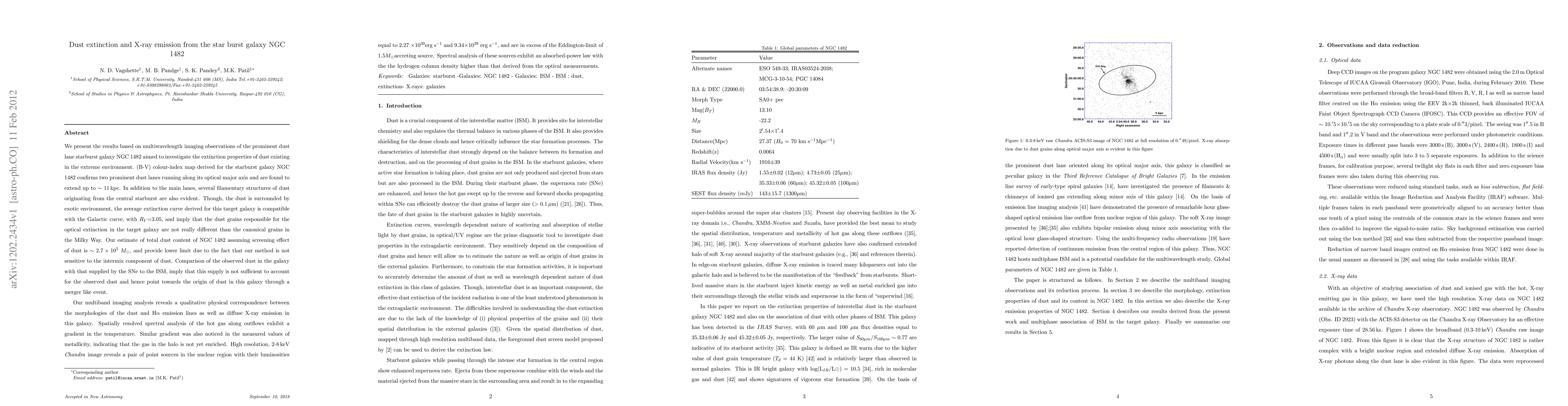 We present the results based on multiwavelength imaging observations of the prominent dust lane starburst galaxy NGC 1482 aimed to investigate the extinction properties of dust existing in the extreme environment. (B-V) colour-index map derived for the starburst galaxy NGC 1482 confirms two prominent dust lanes running along its optical major axis and are found to extend up to \sim 11 kpc. In addition to the main lanes, several filamentary structures of dust originating from the central starburst are also evident. Though, the dust is surrounded by exotic environment, the average extinction curve derived for this target galaxy is compatible with the Galactic curve, with RV =3.05, and imply that the dust grains responsible for the optical extinction in the target galaxy are not really different than the canonical grains in the Milky Way. Our estimate of total dust content of NGC 1482 assuming screening effect of dust is \sim 2.7 \times 10^5 Msun, and provide lower limit due to the fact that our method is not sensitive to the intermix component of dust. Comparison of the observed dust in the galaxy with that supplied by the SNe to the ISM, imply that this supply is not sufficient to account for the observed dust and hence point towards the origin of dust in this galaxy through a merger like event. Our multiband imaging analysis reveals a qualitative physical correspondence between the morphologies of the dust and H{\alpha} emission lines as well as diffuse X-ray emission in this galaxy. continue.... for more detail please see in pdf file.