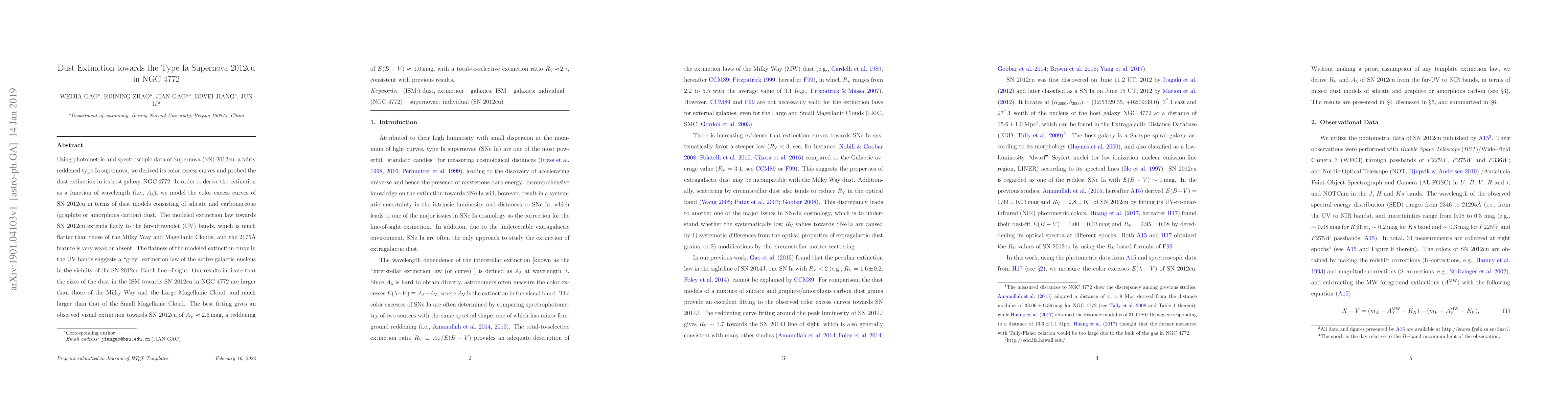 This study analyzes dust extinction towards the type Ia supernova 2012cu in NGC 4772 using photometric and spectroscopic data, revealing a flat extinction curve in the far-ultraviolet and larger dust sizes compared to the Milky Way, with an observed visual extinction of $A_V \approx 2.6$ mag.