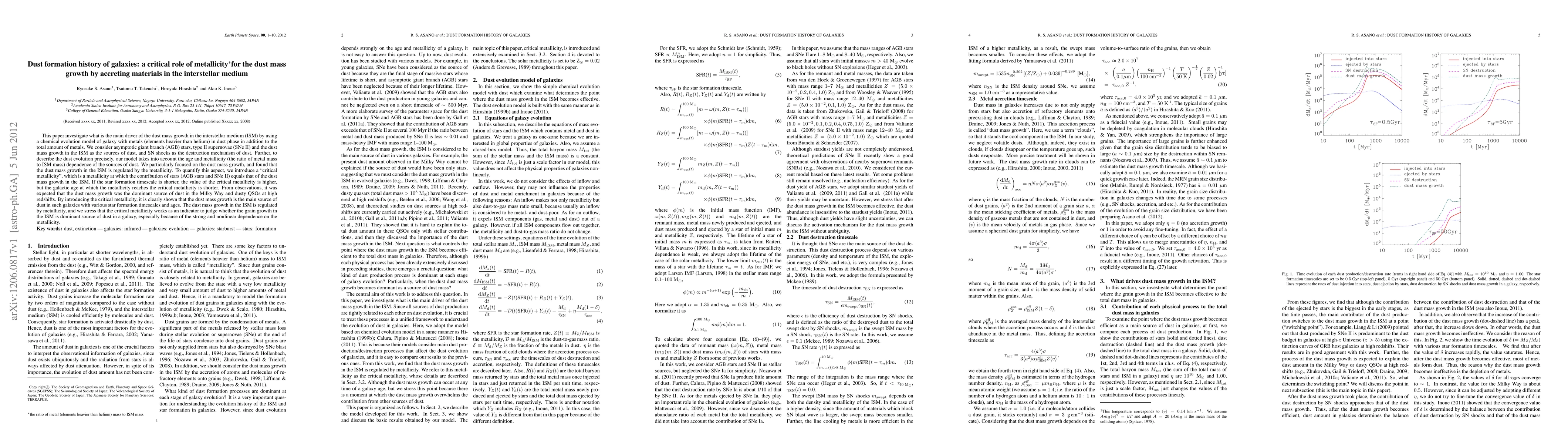 This paper uses a chemical evolution model to investigate the main driver of dust mass growth in the interstellar medium, finding that metallicity plays a critical role. It introduces a "critical metallicity" indicating the point where star contributions equal dust growth, showing that dust mass growth is the dominant source in galaxies with varying star formation timescales and ages.