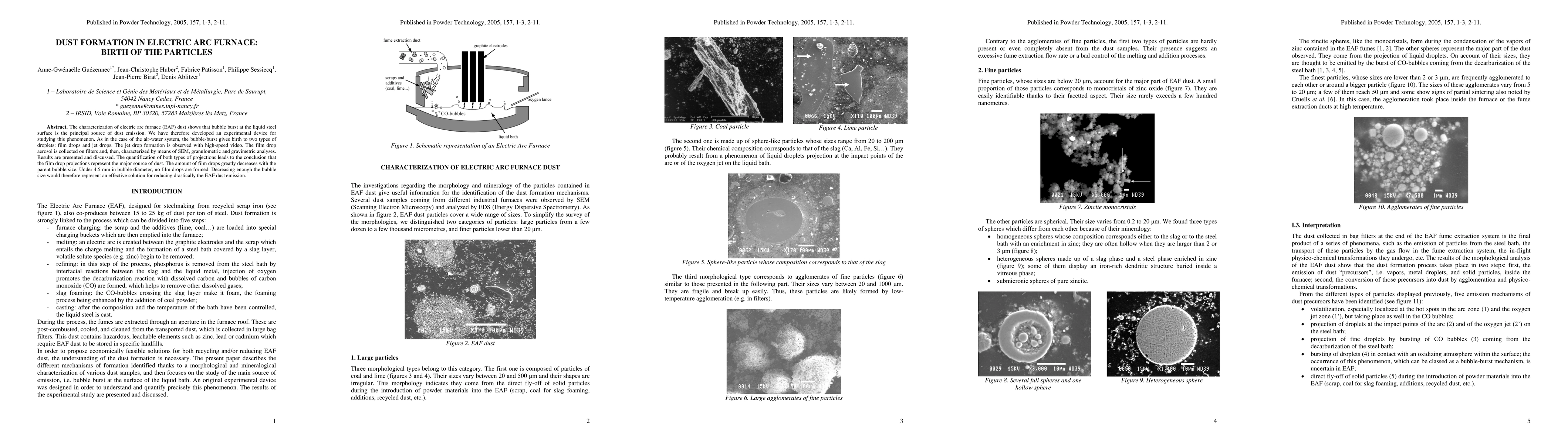 The characterization of Electric Arc Furnace (EAF) dust shows that bubble burst at the liquid steel surface is the principal source of dust emission. We have therefore developed an experimental device for studying this phenomenon. As in the case of the air-water system, the bubble-burst gives birth to two types of droplets: film drops and jet drops. The jet drop formation is observed with high-speed video. The film drop aerosol is collected on filters and then characterized by means of SEM, granulometric and gravimetric analyses. Results are presented and discussed. The quantification of both types of projections leads to the conclusion that the film drop projections represent the major source of dust. The amount of film drops greatly decreases with the parent bubble size. Under 4.5 mm in bubble diameter, no film drops are formed. Decreasing enough the bubble size would therefore represent an effective solution for reducing drastically the EAF dust emission.