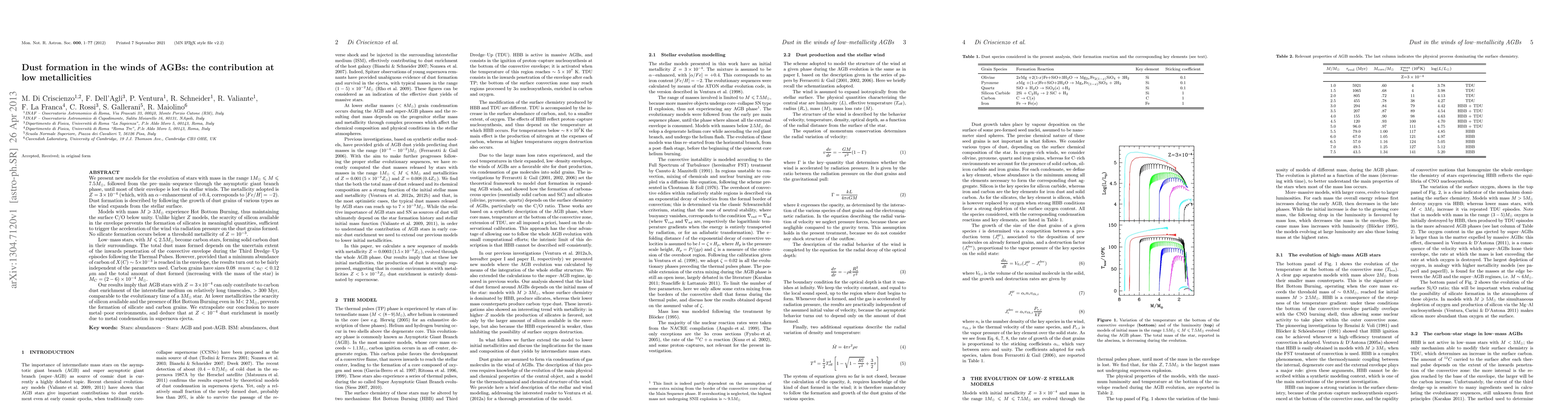 We present new models for the evolution of stars with mass in the range 1Msun < M < 7.5Msun, followed from the pre-main-sequence through the asymptotic giant branch phase. The metallicity adopted is $Z=3*10^{-4} (which, with an alpha-enhancement of +0.4, corresponds to [Fe/H]=-2). Dust formation is described by following the growth of dust grains of various types as the wind expands from the stellar surface. Models with mass M>3Msun experience Hot Bottom Burning, thus maintaining the surface C/O below unity. Unlike higher Z models, the scarcity of silicon available in the envelope prevents the formation of silicates in meaningful quantities, sufficient to trigger the acceleration of the wind via radiation pressure on the dust grains formed. No silicate formation occurs below a threshold metallicity of Z=10^{-3}. Low--mass stars, with M< 2.5Msun become carbon stars, forming solid carbon dust in their surroundings. The total dust mass formed depends on the uncertain extent of the inwards penetration of the convective envelope during the Third Dredge--Up episodes following the Thermal Pulses. Carbon grains have sizes 0.08 micron < a_C < 0.12 micron and the total amount of dust formed (increasing with the mass of the star) is M_C=(2-6)*10^{-4}Msun. Our results imply that AGB stars with Z=3*10^{-4} can only contribute to carbon dust enrichment of the interstellar medium on relatively long timescales, > 300 Myr, comparable to the evolutionary time of a 3Msun star. At lower metallicities the scarcity of silicon available and the presence of Hot Bottom Burning even in M< 2Msun, prevents the formation of silicate and carbon grains. We extrapolate our conclusion to more metal--poor environments, and deduce that at Z < 10^{-4} dust enrichment is mostly due to metal condensation in supernova ejecta.