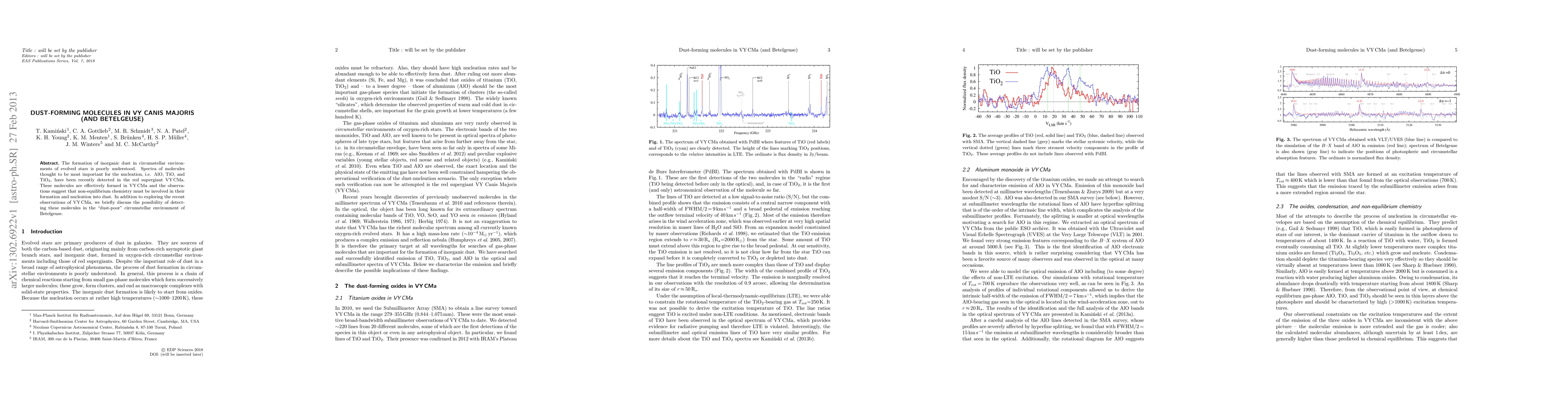 The formation of inorganic dust in circumstellar environments of evolved stars is poorly understood. Spectra of molecules thought to be most important for the nucleation, i.e. AlO, TiO, and TiO2, have been recently detected in the red supergiant VY CMa. These molecules are effectively formed in VY CMa and the observations suggest that non-equilibrium chemistry must be involved in their formation and nucleation into dust. In addition to exploring the recent observations of VY CMa, we briefly discuss the possibility of detecting these molecules in the dust-poor circumstellar environment of Betelgeuse.