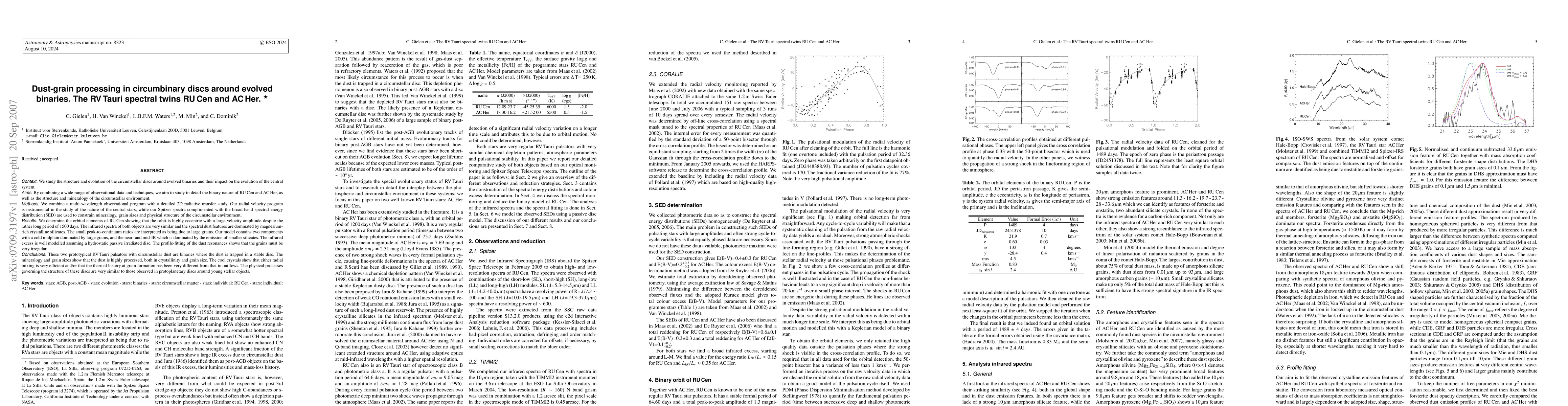 This study investigates the circumstellar discs around the evolved binaries RU Cen and AC Her, revealing highly eccentric orbits and processed dust dominated by Mg-rich crystalline silicates. The dust grains are large and irregular, suggesting efficient radial mixing or unique thermal histories.