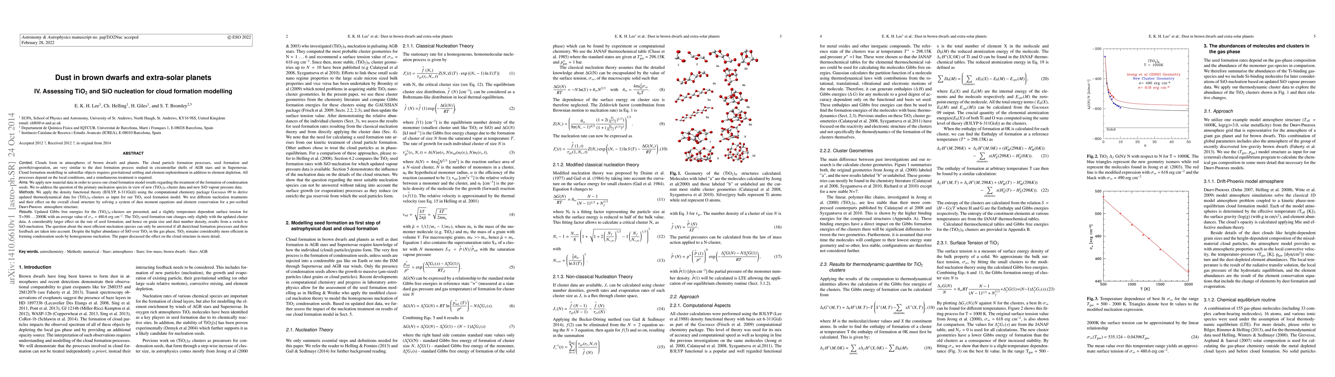 Clouds form in atmospheres of brown dwarfs and planets. The cloud particle formation processes are similar to the dust formation process studied in circumstellar shells of AGB stars and in Supernovae. Cloud formation modelling in substellar objects requires gravitational settling and element replenishment in addition to element depletion. All processes depend on the local conditions, and a simultaneous treatment is required. We apply new material data in order to assess our cloud formation model results regarding the treatment of the formation of condensation seeds. We re-address the question of the primary nucleation species in view of new (TiO2)_N-cluster data and new SiO vapour pressure data. We apply the density functional theory using the computational chemistry package Gaussian 09 to derive updated thermodynamical data for (TiO2)_N-clusters as input for our TiO2 seed formation model. We test different nucleation treatments and their effect on the overall cloud structure by solving a system of dust moment equations and element conservation or a pre-scribed Drift-Phoenix atmosphere structure. Updated Gibbs free energies for the (TiO2)_N-clusters are presented, and a slightly temperature dependent surface tension for T=500 ... 2000K with an average value of sigma_infty = 480.6 erg 1/cm2. The TiO2-seed formation rate changes only slightly with the updated cluster data. A considerably larger effect on the rate of seed formation, and hence on grain size and dust number density, results from a switch to SiO-nucleation. Despite the higher abundance of SiO over TiO2 in the gas phase, TiO2 remains considerably more efficient in forming condensation seeds by homogeneous nucleation followed by heterogeneous grain growth. The paper discussed the effect on the cloud structure in more detail.