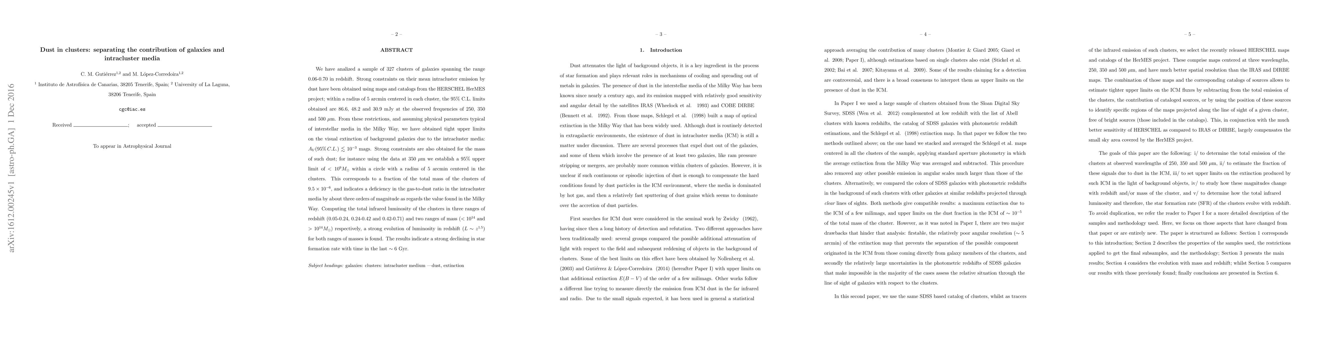 We have analized a sample of 327 clusters of galaxies spanning the range 0.06-0.70 in redshift. Strong constraints on their mean intracluster emission by dust have been obtained using maps and catalogs from the HERSCHEL HerMES project; within a radius of 5 arcmin centered in each cluster, the 95% C.L. limits obtained are 86.6, 48.2 and 30.9 mJy at the observed frequencies of 250, 350 and 500 $\mu$m. From these restrictions, and assuming physical parameters typical of interstellar media in the Milky Way, we have obtained tight upper limits on the visual extinction of background galaxies due to the intracluster media: $A_V$(95% C.L.) <~$10^{-3}$ mags. Strong constraints are also obtained for the mass of such dust; for instance using the data at 350 $\mu$m we establish a 95% upper limit of $<10^9M_\odot$ within a circle with a radius of 5 arcmin centered in the clusters. This corresponds to a fraction of the total mass of the clusters of $9.5\times 10^{-6}$, and indicates a deficiency in the gas-to-dust ratio in the intracluster media by about three orders of magnitude as regards the value found in the Milky Way. Computing the total infrared luminosity of the clusters in three ranges of redshift (0.05-0.24, 0.24-0.42 and 0.42-0.71) and two ranges of mass ($<10^{14}$ and $>10^{14}M_\odot$) respectively, a strong evolution of luminosity in redshift ($L\sim z^{1.5}$) for both ranges of masses is found. The results indicate a strong declining in star formation rate with time in the last $\sim 6$ Gyr.