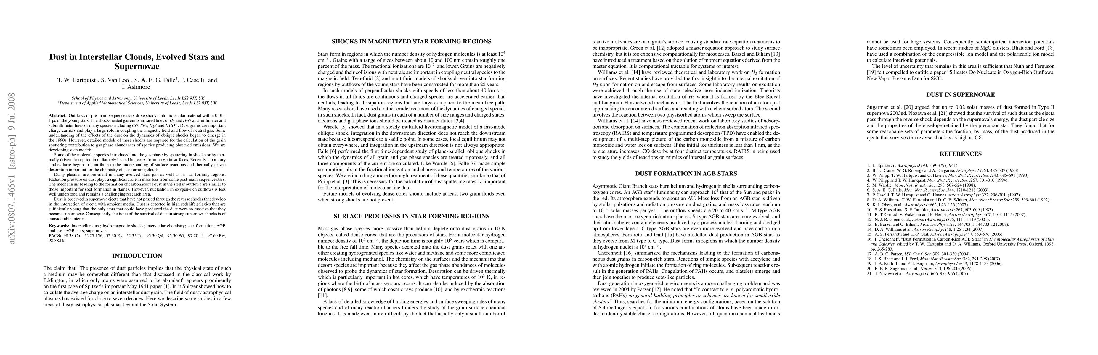Outflows of pre-main-sequence stars drive shocks into molecular material within 0.01 - 1 pc of the young stars. The shock-heated gas emits infrared, millimeter and submillimeter lines of many species including. Dust grains are important charge carriers and play a large role in coupling the magnetic field and flow of neutral gas. Some effects of the dust on the dynamics of oblique shocks began to emerge in the 1990s. However, detailed models of these shocks are required for the calculation of the grain sputtering contribution to gas phase abundances of species producing observed emissions. We are developing such models. Some of the molecular species introduced into the gas phase by sputtering in shocks or by thermally driven desorption in hot cores form on grain surfaces. Recently laboratory studies have begun to contribute to the understanding of surface reactions and thermally driven desorption important for the chemistry of star forming clouds. Dusty plasmas are prevalent in many evolved stars just as well as in star forming regions. Radiation pressure on dust plays a significant role in mass loss from some post-main-sequence stars. The mechanisms leading to the formation of carbonaceous dust in the stellar outflows are similar to those important for soot formation in flames. However, nucleation in oxygen-rich outflows is less well understood and remains a challenging research area. Dust is observed in supernova ejecta that have not passed through the reverse shocks that develop in the interaction of ejecta with ambient media. Dust is detected in high redshift galaxies that are sufficiently young that the only stars that could have produced the dust were so massive that they became supernovae. Consequently, the issue of the survival of dust in strong supernova shocks is of considerable interest.