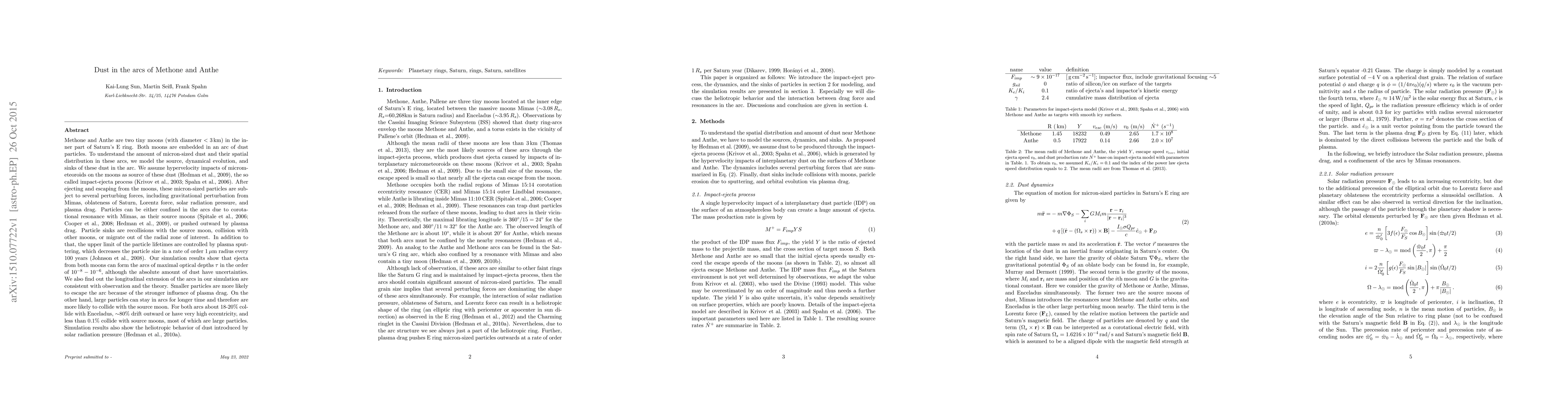 Methone and Anthe are two tiny moons (with diameter $<3$ km) in the inner part of Saturn's E ring. Both moons are embedded in an arc of dust particles. To understand the amount of micron-sized dust and their spatial distribution in these arcs, we model the source, dynamical evolution, and sinks of these dust in the arc. We assume hypervelocity impacts of micrometeoroids on the moons as source of these dust (Hedman et al., 2009), the so called impact-ejecta process (Krivov et al., 2003; Spahn et al., 2006). After ejecting and escaping from the moons, these micron-sized particles are subject to several perturbing forces, including gravitational perturbation from Mimas, oblateness of Saturn, Lorentz force, solar radiation pressure, and plasma drag. Particles can be either confined in the arcs due to corotational resonance with Mimas, as their source moons (Spitale et al., 2006; Cooper et al., 2008; Hedman et al., 2009), or pushed outward by plasma drag. Particle sinks are recollisions with the source moon, collision with other moons, or migrate out of the radial zone of interest. In addition to that, the upper limit of the particle lifetimes are controlled by plasma sputtering, which decreases the particle size in a rate of order 1$\mu$m radius every 100 years (Johnson et al., 2008). Our simulation results show that ejecta from both moons can form the arcs of maximal optical depths $\tau$ in the order of $10^{-8} - 10^{-6}$, although the absolute amount of dust have uncertainties. We also find out the longitudinal extension of the arcs in our simulation are consistent with observation and the theory. Smaller particles are more likely to escape the arc because of the stronger influence of plasma drag. On the other hand, large particles can stay in arcs for longer time and therefore are more likely to collide with the source moon.