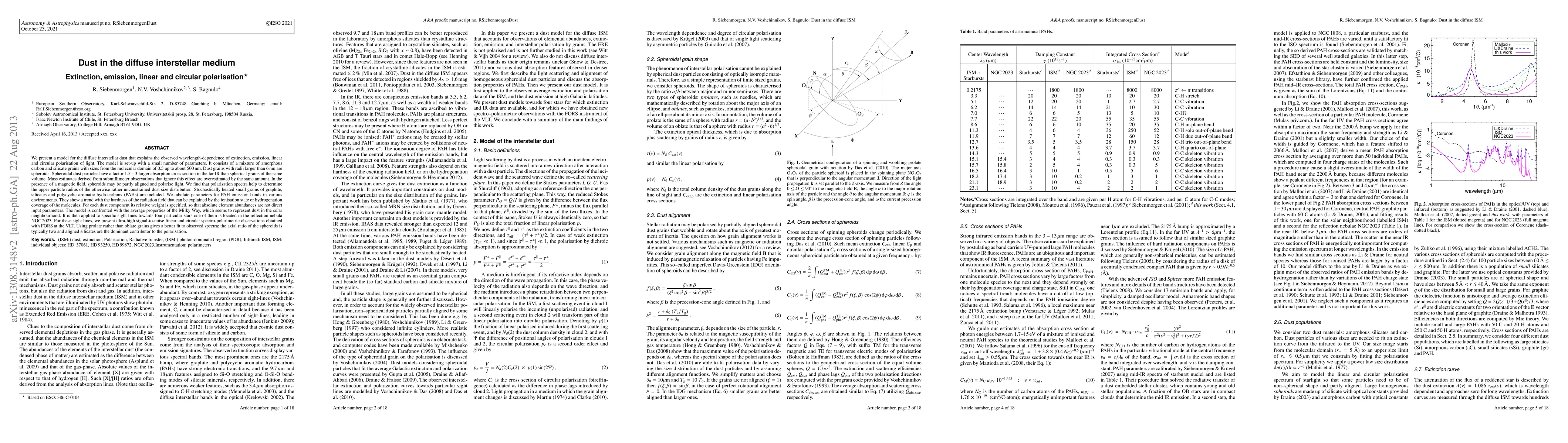 We present a model for the diffuse interstellar dust that explains the observed wavelength-dependence of extinction, emission, linear and circular polarisation of light. The model is set-up with a small number of parameters. It consists of a mixture of amorphous carbon and silicate grains with sizes from the molecular domain of 0.5 up to about 500nm. Dust grains with radii larger than 6nm are spheroids. Spheroidal dust particles have a factor 1.5 - 3 larger absorption cross section in the far IR than spherical grains of the same volume. Mass estimates derived from submillimeter observations that ignore this effect are overestimated by the same amount. In the presence of a magnetic field, spheroids may be partly aligned and polarise light. We find that polarisation spectra help to determine the upper particle radius of the otherwise rather unconstrained dust size distribution. Stochastically heated small grains of graphite, silicates and polycyclic aromatic hydrocarbons (PAHs) are included. We tabulate parameters for PAH emission bands in various environments. They show a trend with the hardness of the radiation field that can be explained by the ionisation state or hydrogenation coverage of the molecules. For each dust component its relative weight is specified, so that absolute element abundances are not direct input parameters. The model is confronted with the average properties of the Milky Way, which seems to represent dust in the solar neighbourhood. It is then applied to four specific sight lines including the reflection nebula NGC2023. For these sight lines, we present linear and circular spectro-polarimetric observations obtained with FORS/VLT. Using prolate rather than oblate grains gives a better fit to observed spectra; the axial ratio of the spheroids is typically two and aligned silicates are the dominant contributor to the polarisation.