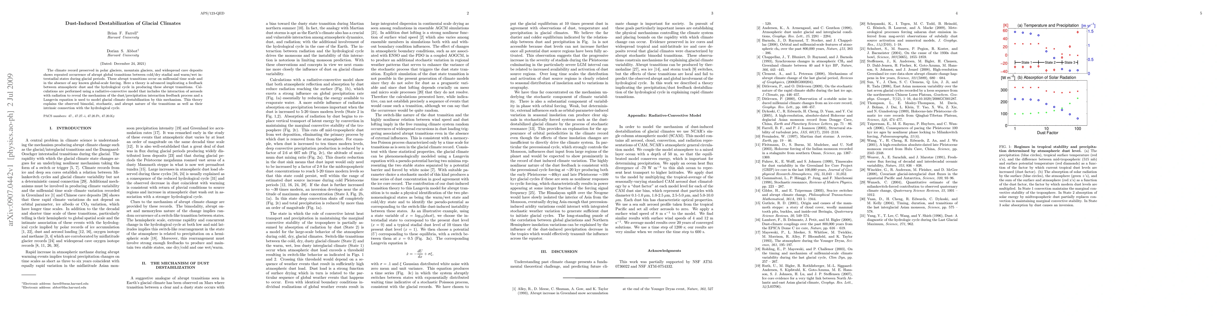 This paper proposes a theory linking atmospheric dust to abrupt climate transitions during glacial periods through a feedback mechanism involving the hydrological cycle, using a radiative-convective model to demonstrate the dust/precipitation interaction and a Langevin equation to model climate destabilization.