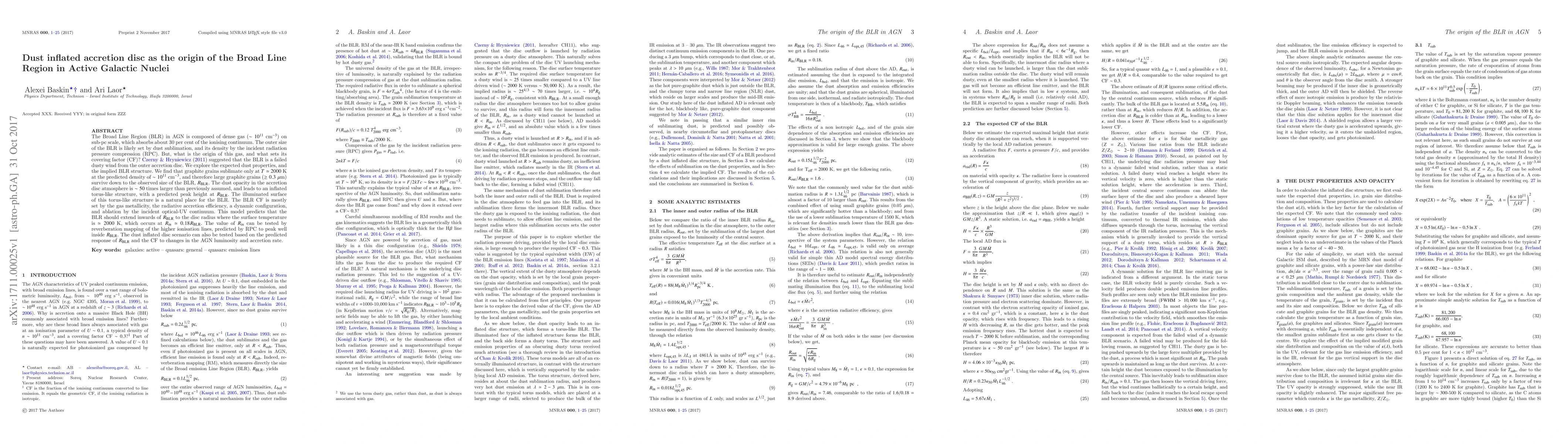 The Broad Line Region (BLR) in AGN is composed of dense gas ($\sim 10^{11}$ cm$^{-3}$) on sub-pc scale, which absorbs about 30 per cent of the ionising continuum. The outer size of the BLR is likely set by dust sublimation, and its density by the incident radiation pressure compression (RPC). But, what is the origin of this gas, and what sets its covering factor (CF)? Czerny & Hryniewicz (2011) suggested that the BLR is a failed dusty wind from the outer accretion disc. We explore the expected dust properties, and the implied BLR structure. We find that graphite grains sublimate only at $T\simeq 2000$ K at the predicted density of $\sim 10^{11}$ cm$^{-3}$, and therefore large graphite grains ($\ge 0.3$ $\mu$m) survive down to the observed size of the BLR, $R_{\rm BLR}$. The dust opacity in the accretion disc atmosphere is $\sim 50$ times larger than previously assumed, and leads to an inflated torus-like structure, with a predicted peak height at $R_{\rm BLR}$. The illuminated surface of this torus-like structure is a natural place for the BLR. The BLR CF is mostly set by the gas metallicity, the radiative accretion efficiency, a dynamic configuration, and ablation by the incident optical-UV continuum. This model predicts that the BLR should extend inwards of $R_{\rm BLR}$ to the disc radius where the surface temperature is $\simeq 2000$ K, which occurs at $R_{\rm in}\simeq 0.18 R_{\rm BLR}$. The value of $R_{\rm in}$ can be tested by reverberation mapping of the higher ionisation lines, predicted by RPC to peak well inside $R_{\rm BLR}$. The dust inflated disc scenario can also be tested based on the predicted response of $R_{\rm BLR}$ and the CF to changes in the AGN luminosity and accretion rate.