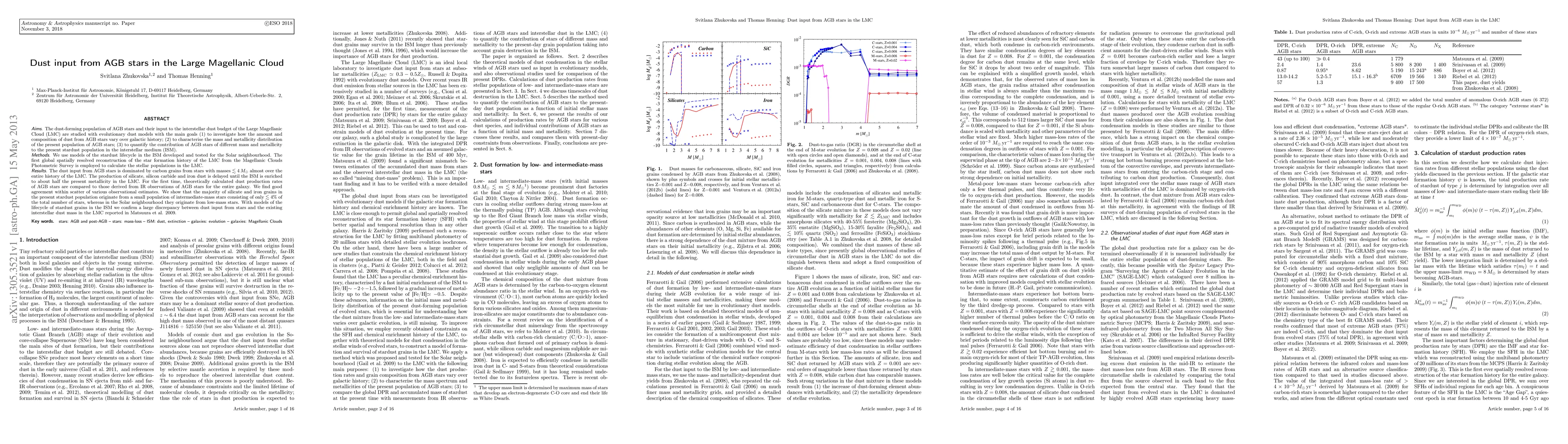 This study investigates the dust contribution from Asymptotic Giant Branch (AGB) stars in the Large Magellanic Cloud (LMC), finding that carbon grains dominate throughout LMC's history, while silicate, silicon carbide, and iron dust production is delayed until the ISM reaches about half the current metallicity. The research confirms a large discrepancy between theoretical dust production and the reported interstellar dust mass in the LMC.