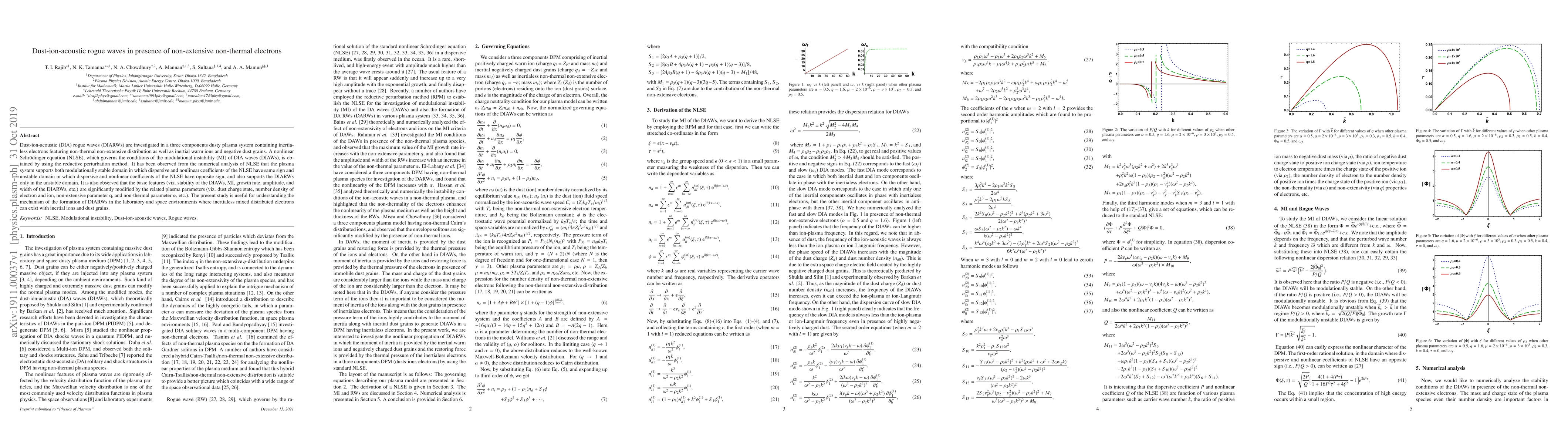 This paper investigates dust-ion-acoustic rogue waves in a dusty plasma system with non-extensive, non-thermal electrons, using a nonlinear Schrödinger equation derived via reductive perturbation. It finds that the system supports both stable and unstable domains, with rogue waves occurring only in the unstable domain, and that plasma parameters significantly modify wave characteristics.