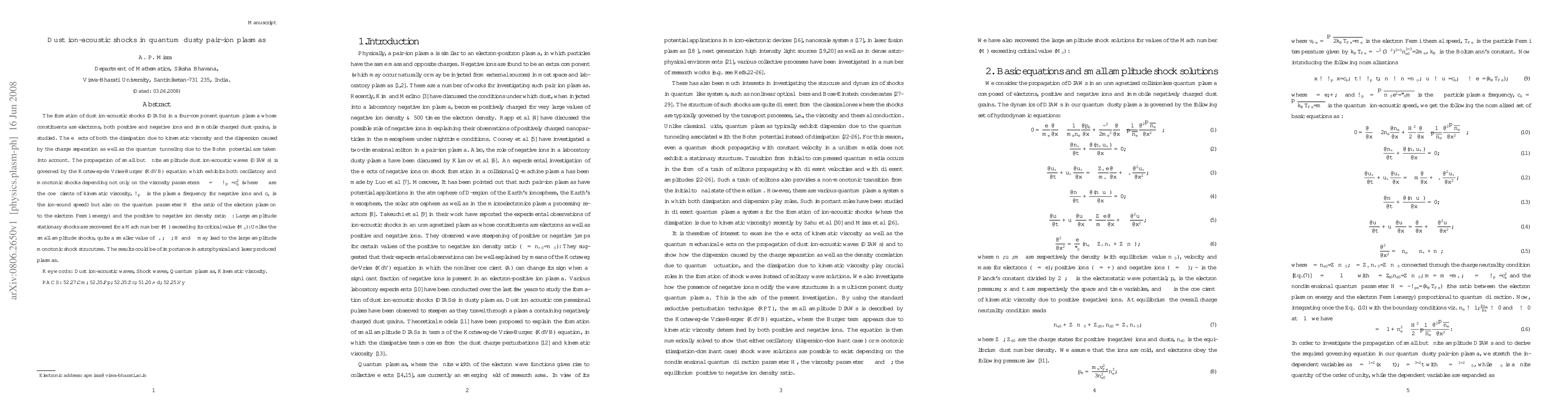 The paper presents a comprehensive analysis of dust ion-acoustic shocks in quantum dusty pair-ion plasmas, incorporating dissipation, dispersion, and quantum tunneling effects, and deriving the KdVB equation for DIAW propagation.