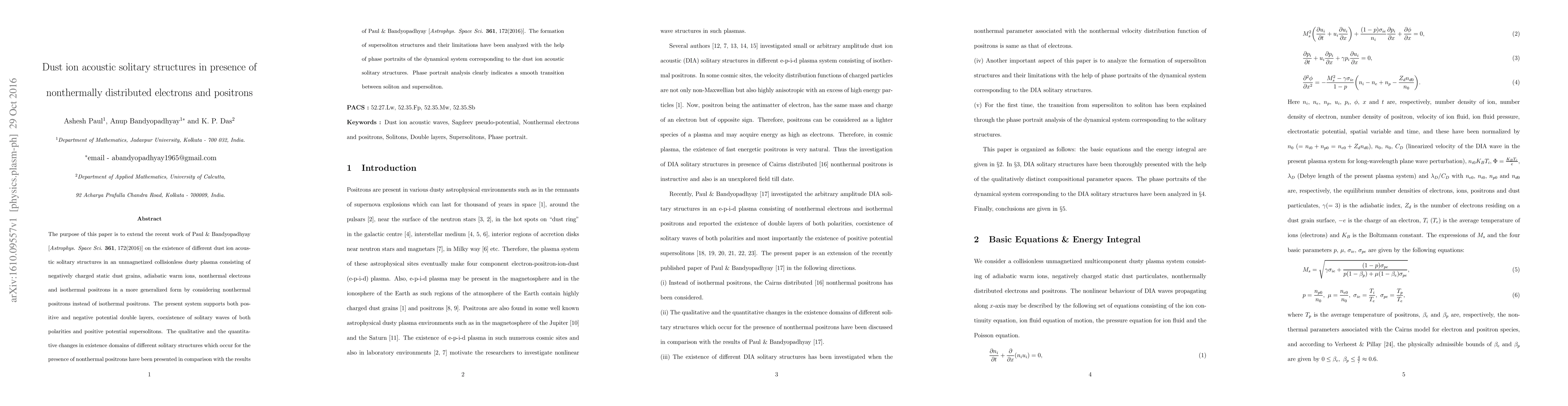 The purpose of this paper is to extend the recent work of Paul & Bandyopadhyay [Astrophys. Space Sci. 361, 172(2016)] on the existence of different dust ion acoustic solitary structures in an unmagnetized collisionless dusty plasma consisting of negatively charged static dust grains, adiabatic warm ions, nonthermal electrons and isothermal positrons in a more generalized form by considering nonthermal positrons instead of isothermal positrons. The present system supports both positive and negative potential double layers, coexistence of solitary waves of both polarities and positive potential supersolitons. The qualitative and the quantitative changes in existence domains of different solitary structures which occur for the presence of nonthermal positrons have been presented in comparison with the results of Paul & Bandyopadhyay [Astrophys. Space Sci. 361, 172(2016)]. The formation of supersoliton structures and their limitations have been analyzed with the help of phase portraits of the dynamical system corresponding to the dust ion acoustic solitary structures. Phase portrait analysis clearly indicates a smooth transition between soliton and supersoliton.